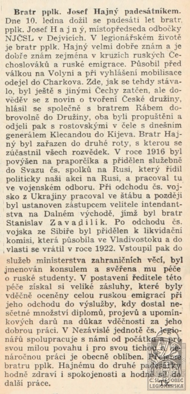 Životopis:Josef Hajný se narodil 10.1.1886 v obci Velice. Vystudoval gymnázium a Filosofickou fakultu. Působil před válkou jako rolník na Volyni, žil v Trišvici, a při vyhlášení mobilizace odejel do Charkova, kde byl s dalšími Čechy zatčen. Hlásil se společně s bratrem Rábem dobrovolně do Družiny a oba odjeli pak s rostovskými Čechy, v čele s Jiřím Klecandou, do Kijeva. Bratr Hajný byl 18.9.1914 zařazen jako vojín do 2. roty České družiny, s kterou se zúčastnil všech rozvědek. V roce 1916 byl povýšen na praporčíka a přidělen služebně do Svazu čs. spolků na Rusi, který řídil politicky akci na Rusi, a pracoval ve vojenském odboru. Při odchodu čs. vojska z Ukrajiny pracoval ve štábu a později byl ustanoven zástupcem velitele intendantstva na Dálném východě Stanislava Zavadilíka. Byl jedním ze zakladatelů a členem prozatímního představenstva Legiobanky. Po odchodu čs. vojska ze Sibiře byl přidělen k likvidační komisi, která působila ve Vladivostoku i po evakuaci. Podplukovník Hájný se vrátil do vlasti teprve v roce 1922.