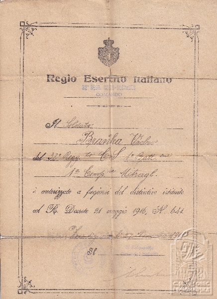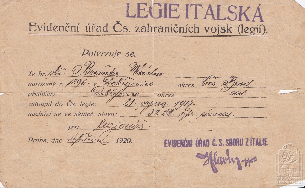Jednotka v době zařazení:32.p.pl. ( Čs. legie v Itálii )