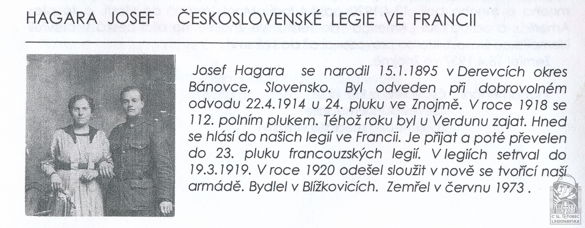 Jednotka v době zařazení:23.p.pl. ( Čs. legie v Francii )