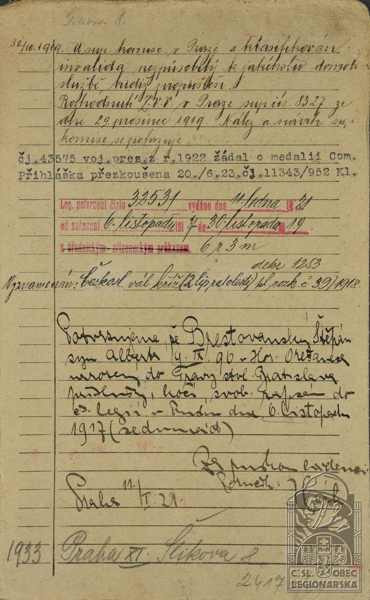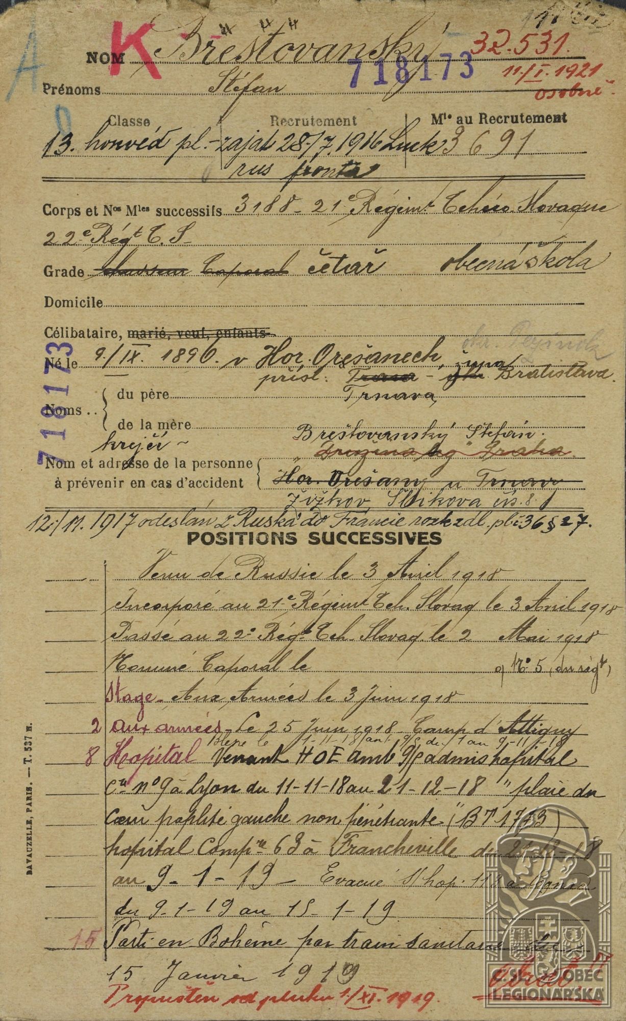Zdroj informací: legionářský poslužný spis osobní karta legionáře