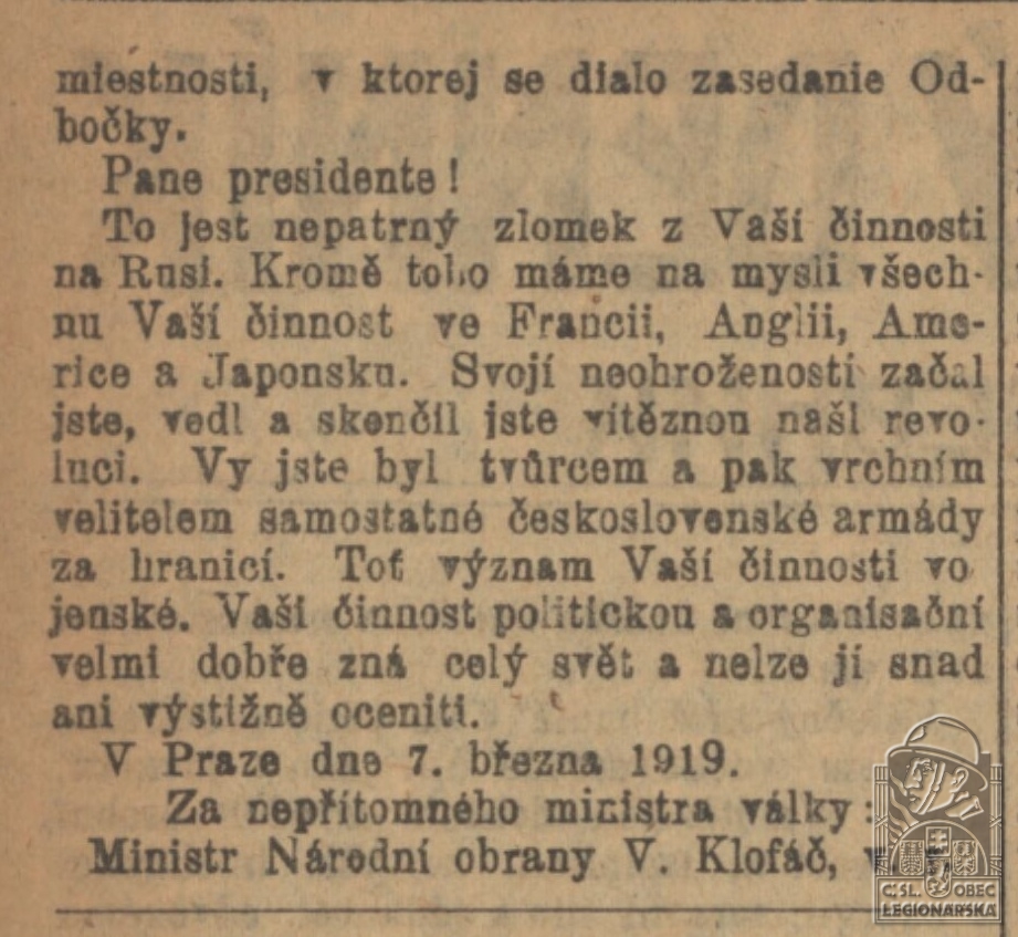 Poznámka:Invalida - ztráta levé nohy; Četl 13.4.1919 při slavnosti u Invalidovny odůvodnění udělení vyznamenání za statečnost T.G.Masarykovi.