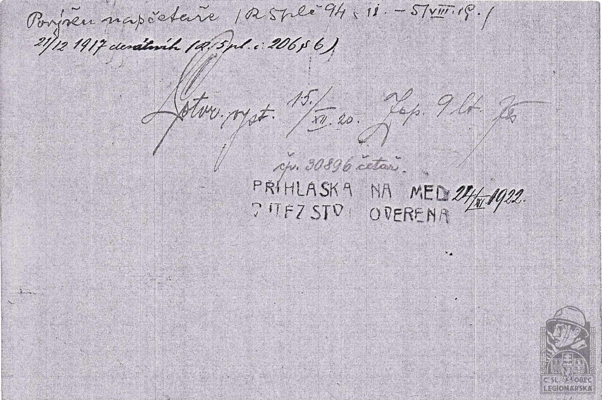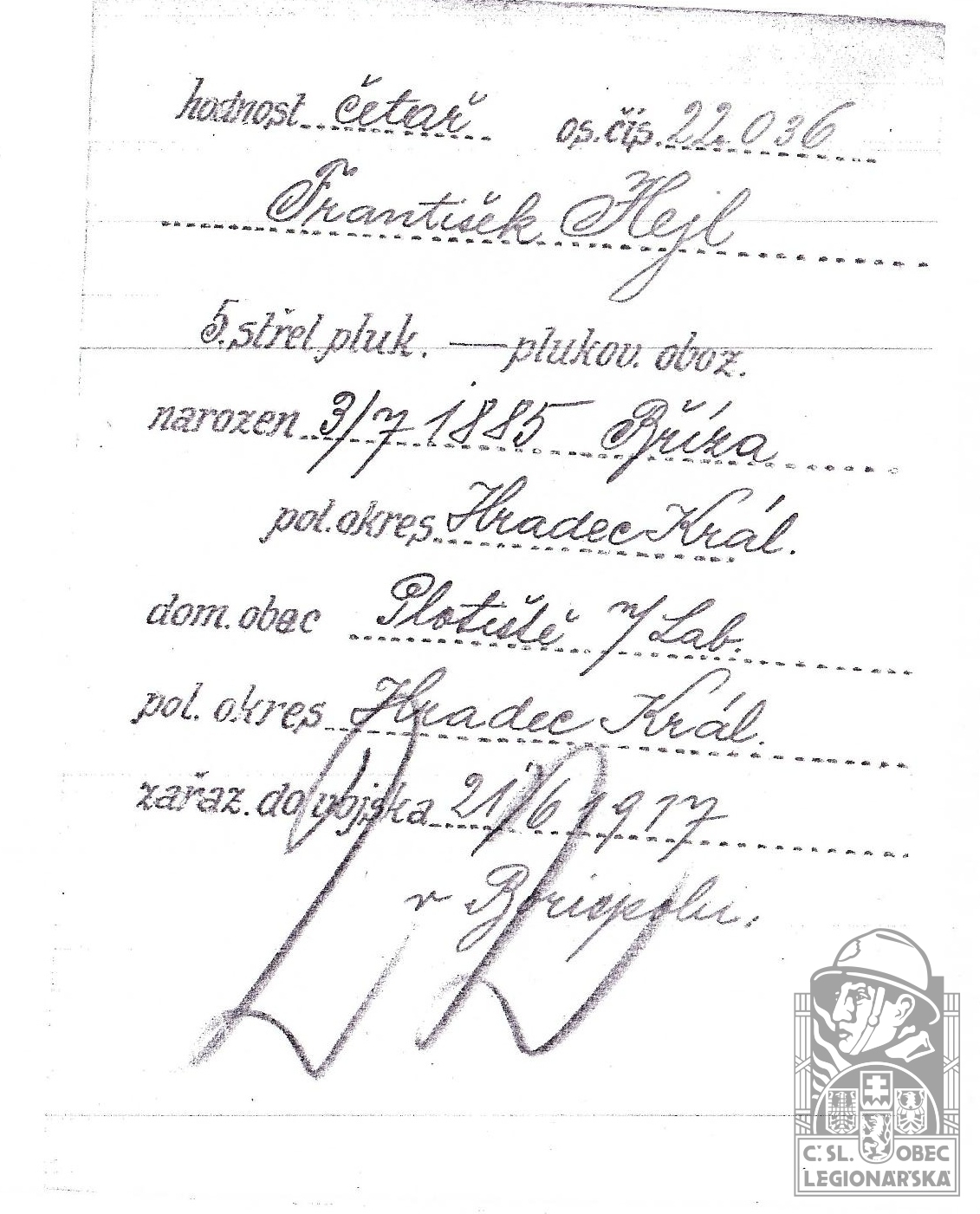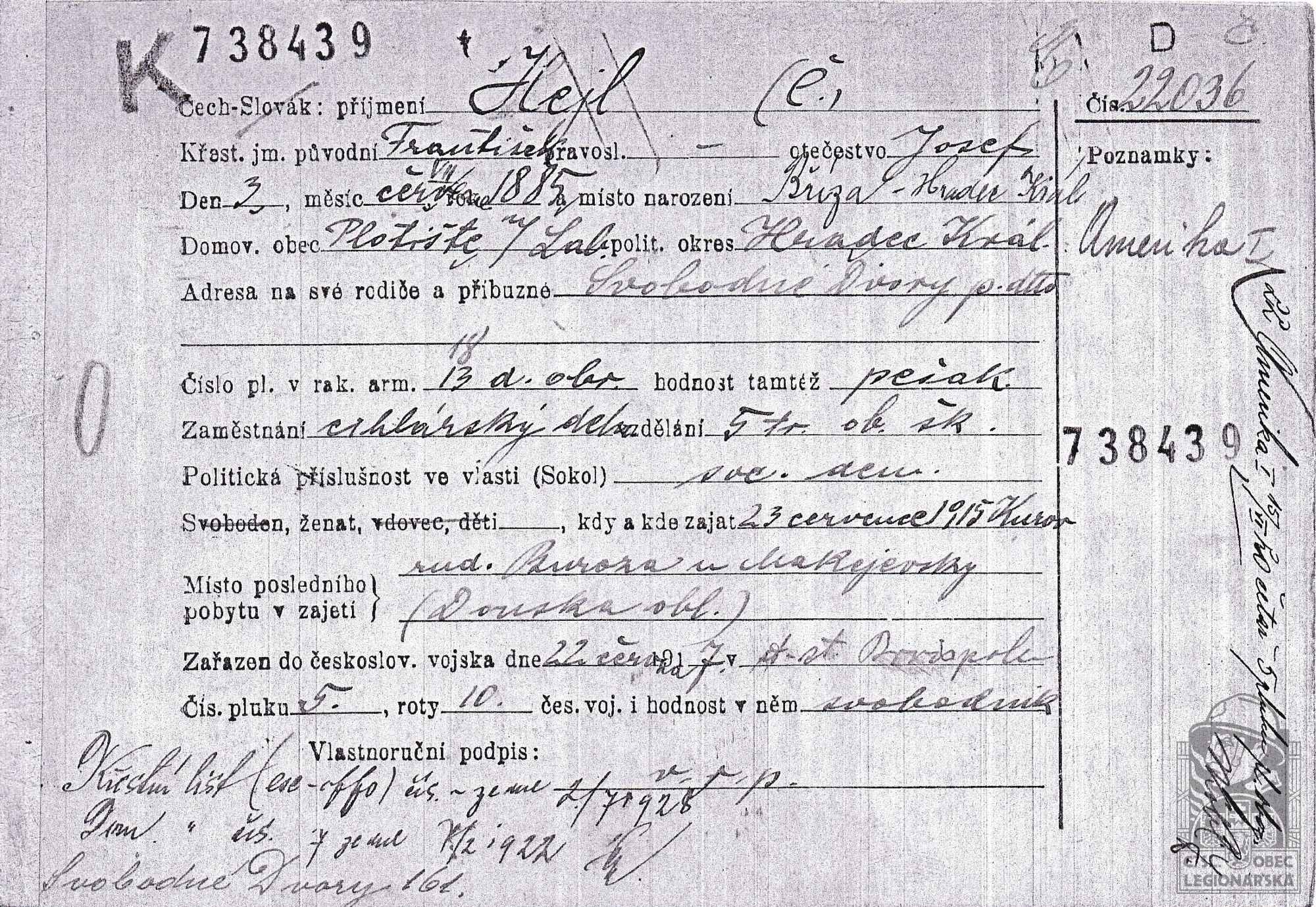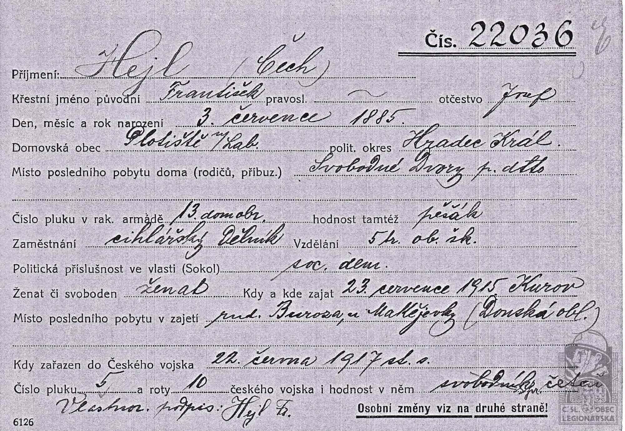 Zdroj informací: legionářský poslužný spis osobní karta legionáře