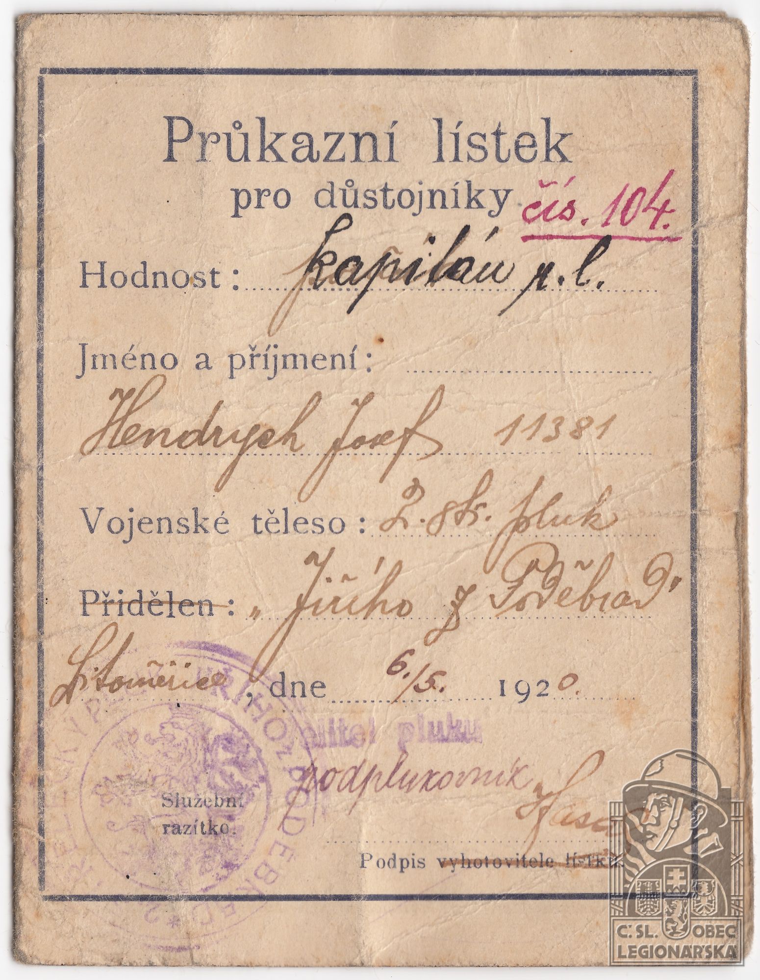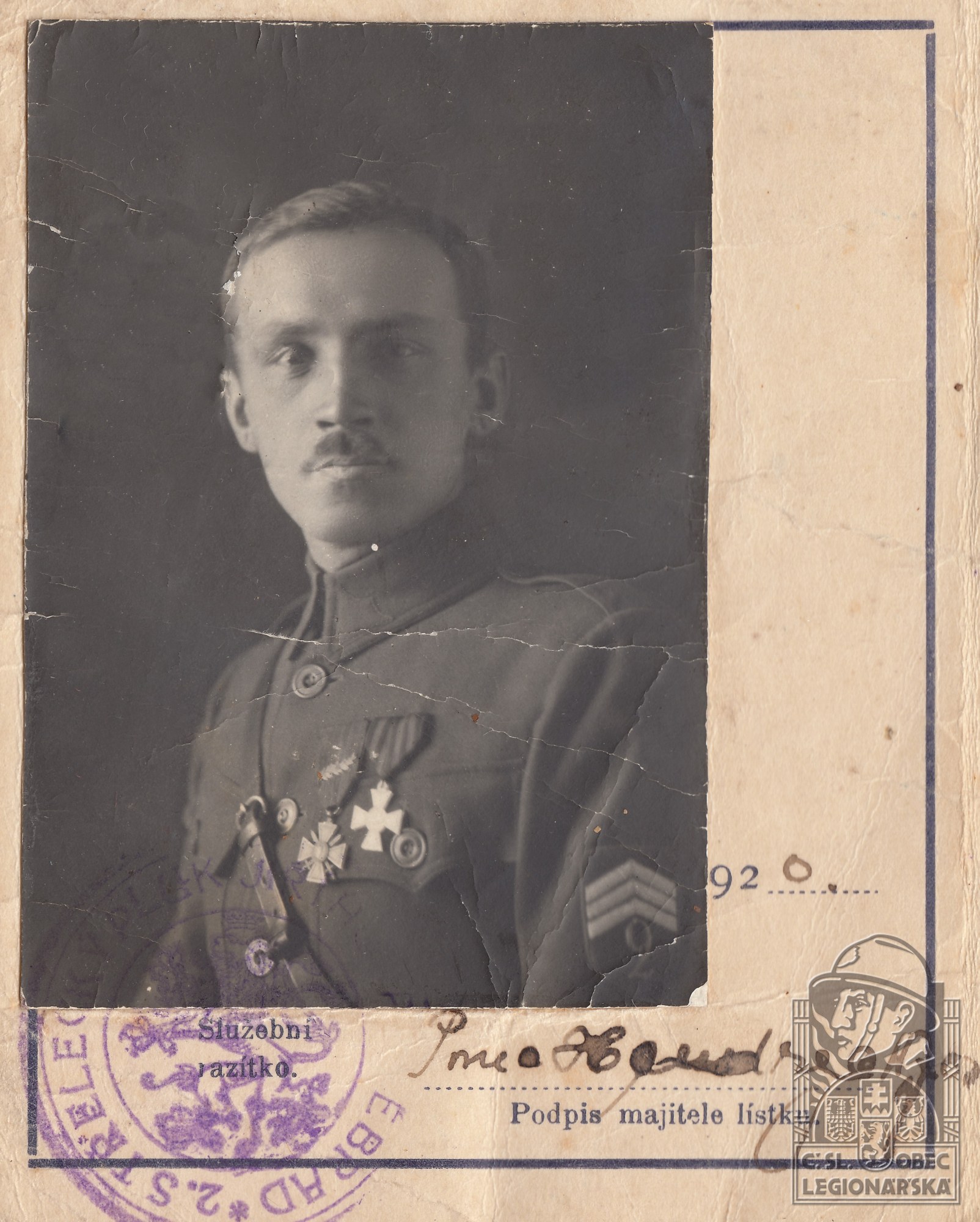 Zdroj informací: legionářský poslužný spis osobní karta legionáře Muzeum Mladoboleslavska. 2018. Mladoboleslavsko a vznik Československa před 100 lety. Mladá Boleslav: Muzeum Mladoboleslavska, ČsOL MB, SOkA MB, 18.9.-18.11.2018. Výstavní panel.