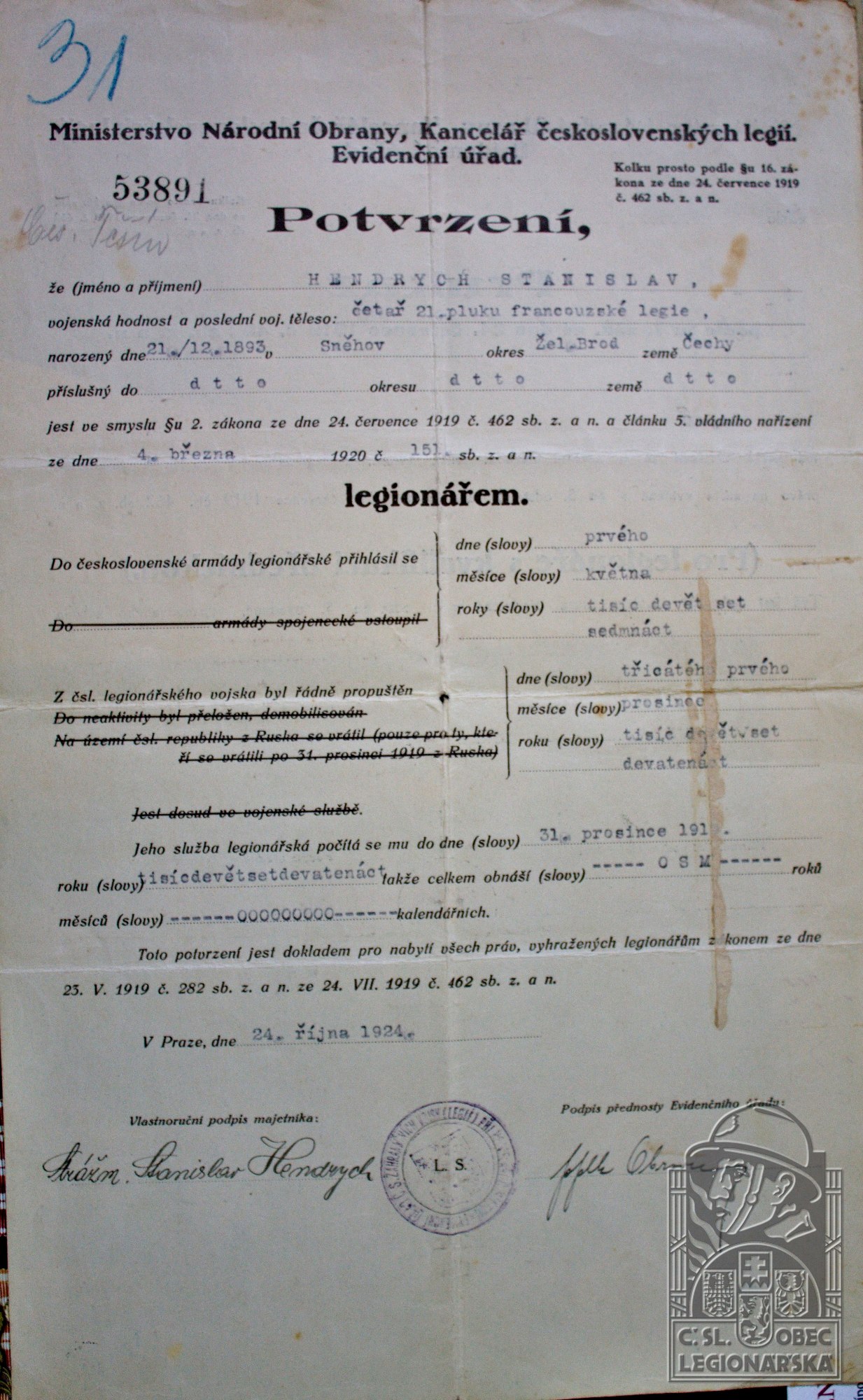 Poslední útvar v legiích:21.p.pl.