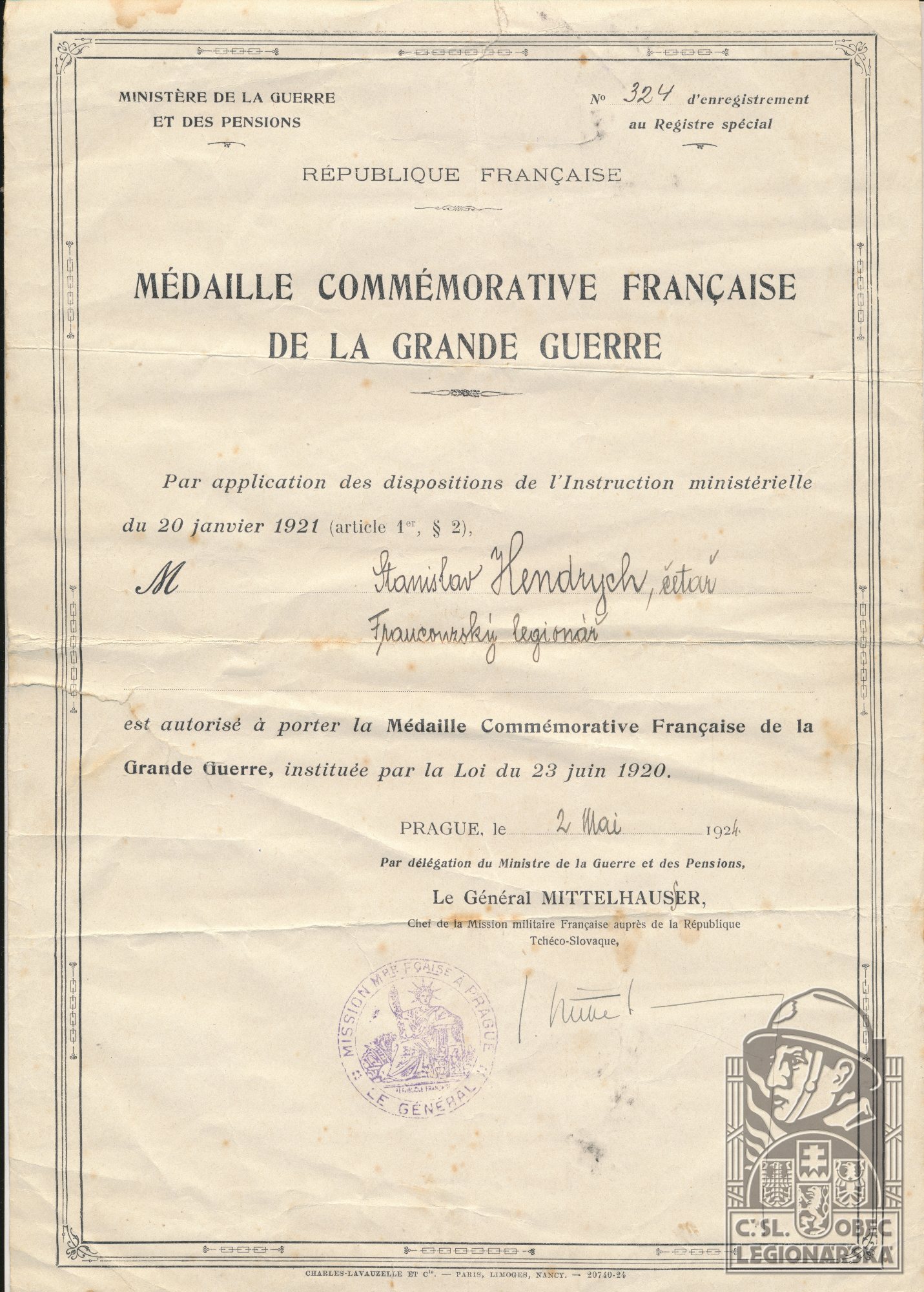 Jednotka v době zařazení:21.p.pl. ( Čs. legie v Francii )