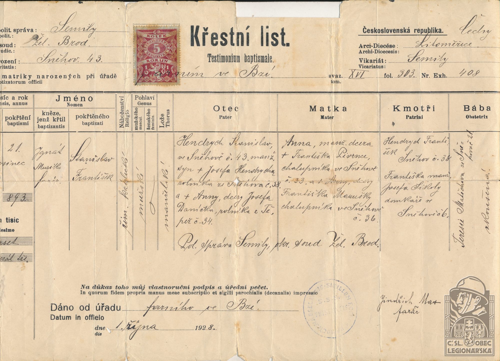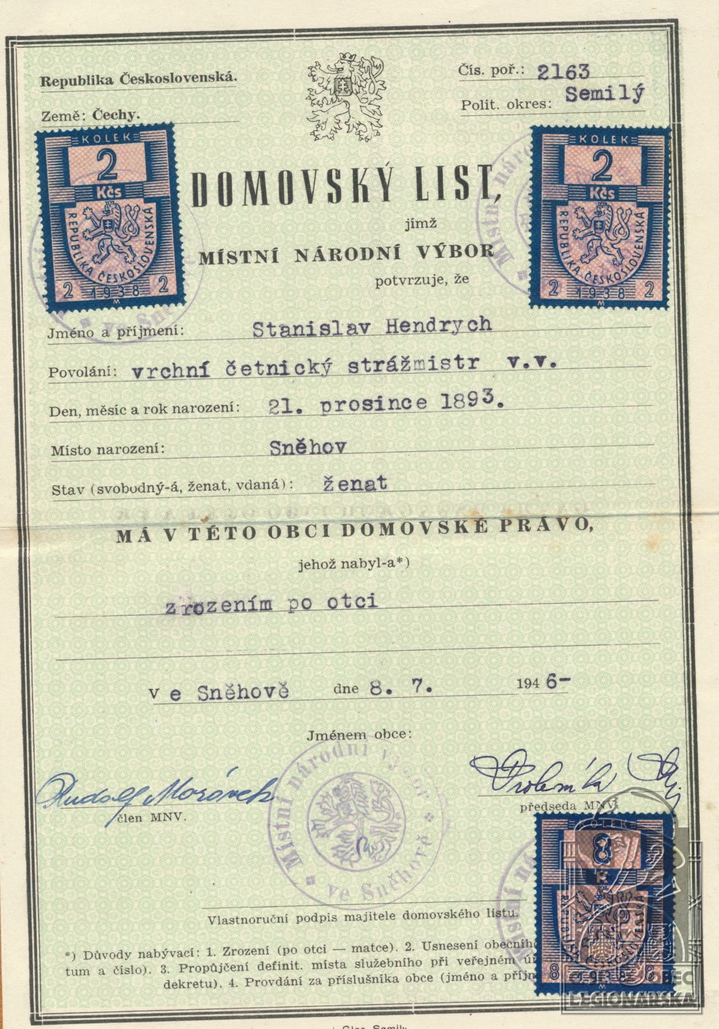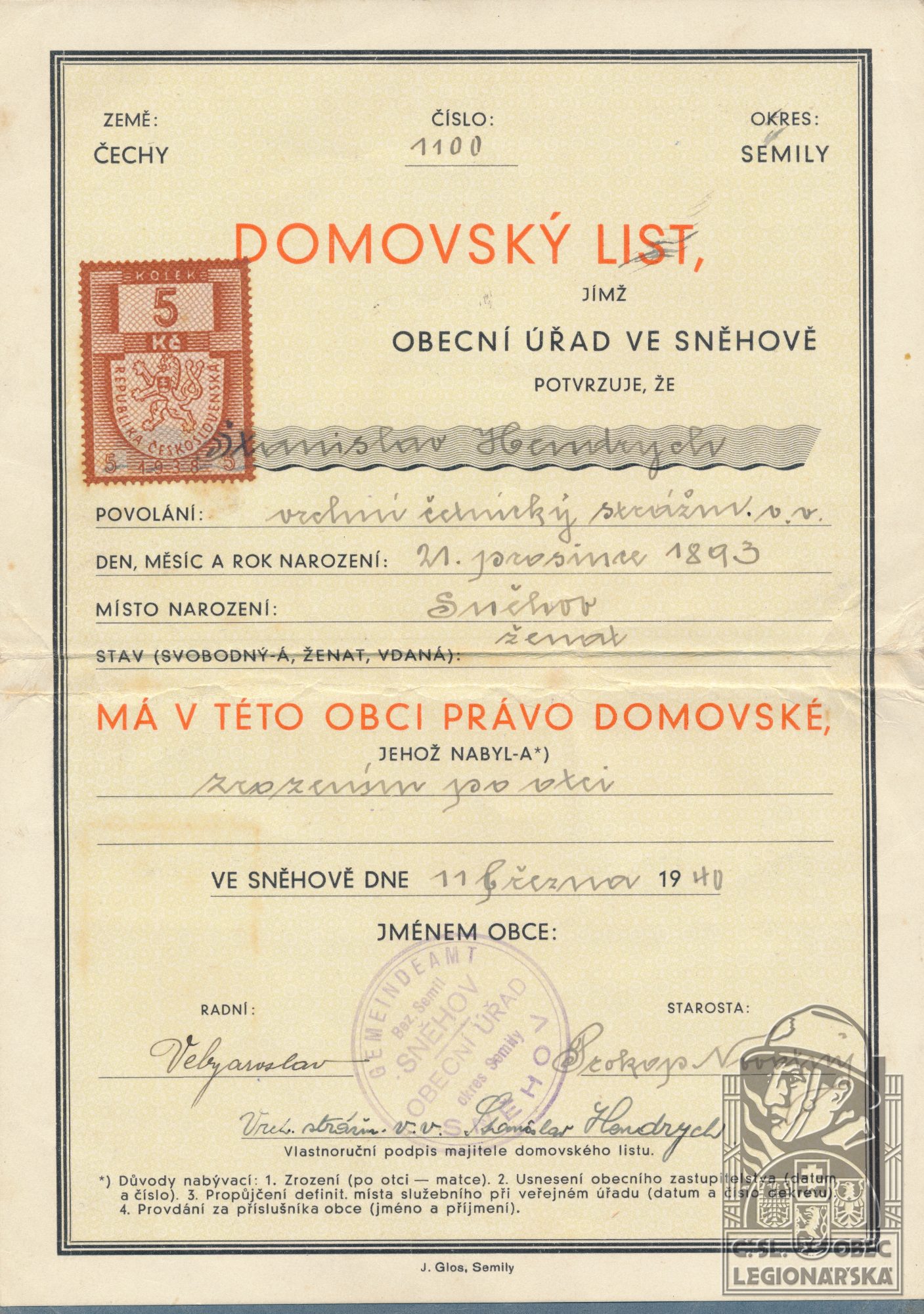 Zdroj informací: legionářský poslužný spis osobní karta legionáře