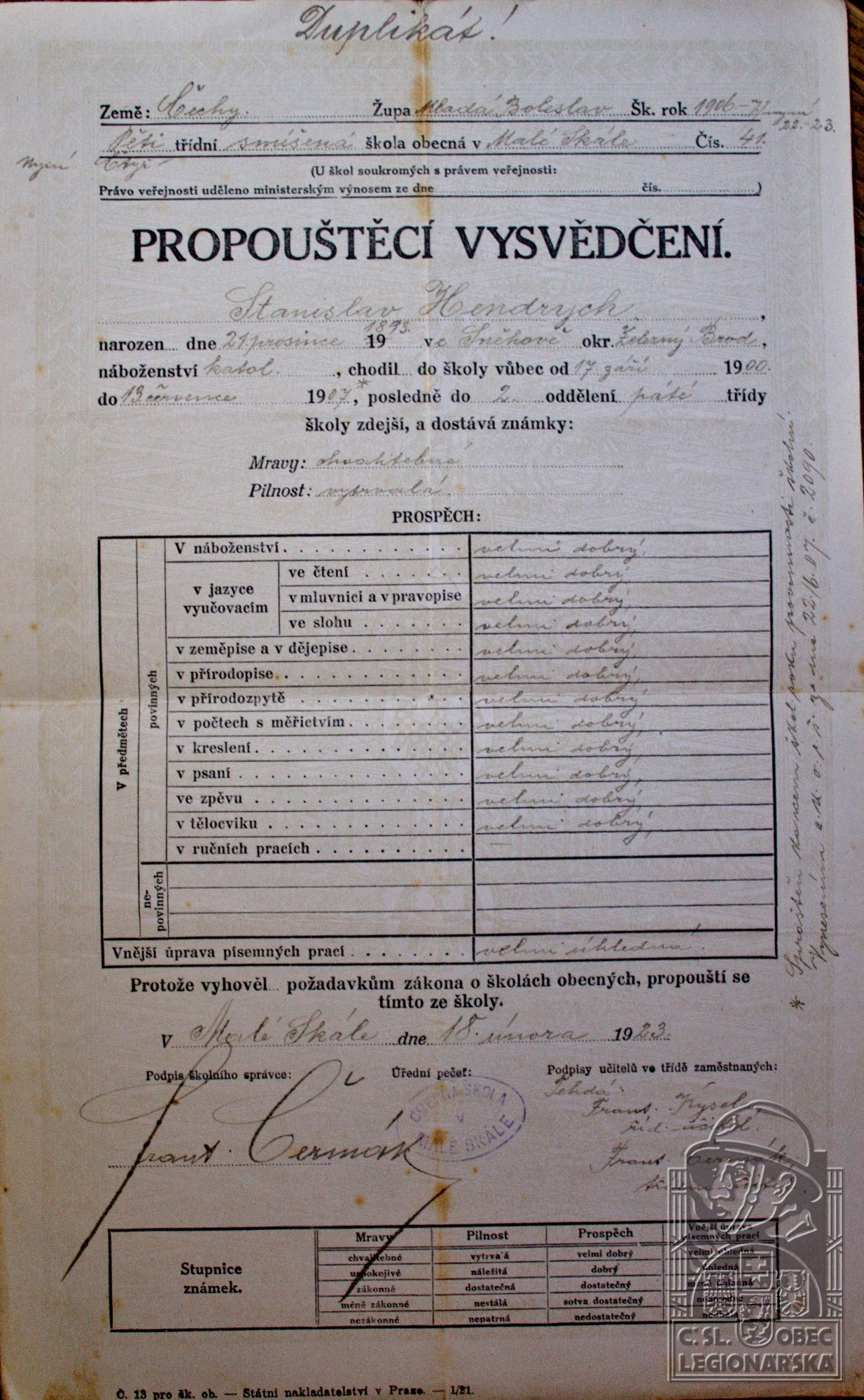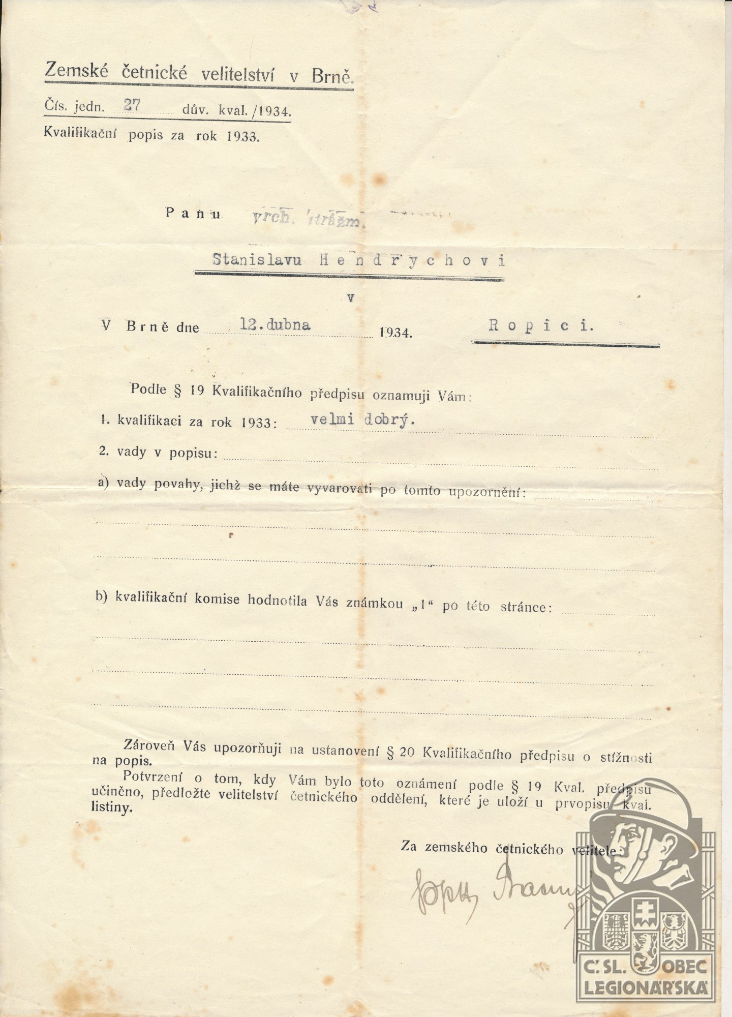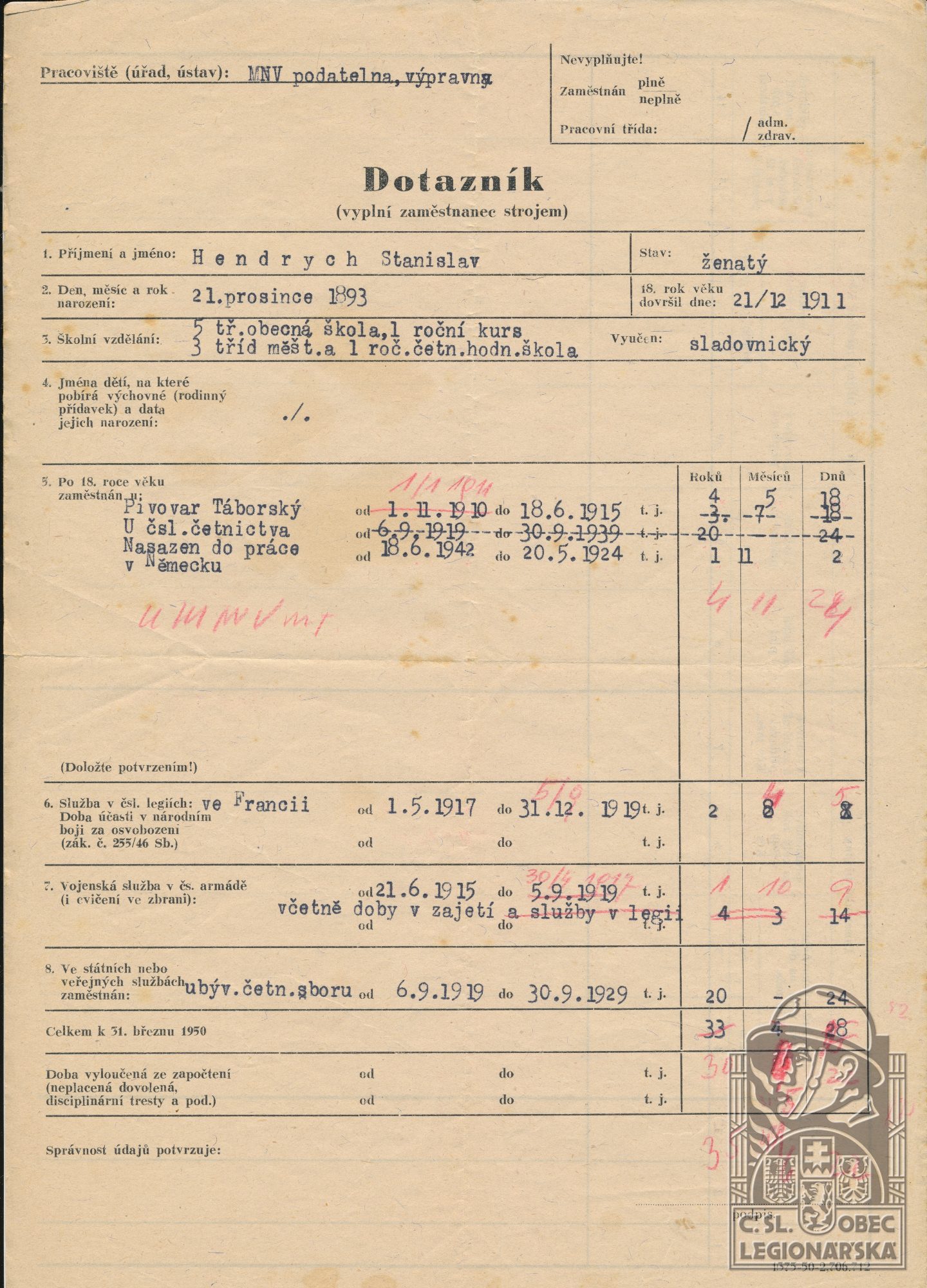 Poznámka:odešel k četnictvu, služba v legii od 1.5.1917 do 31.12.1919