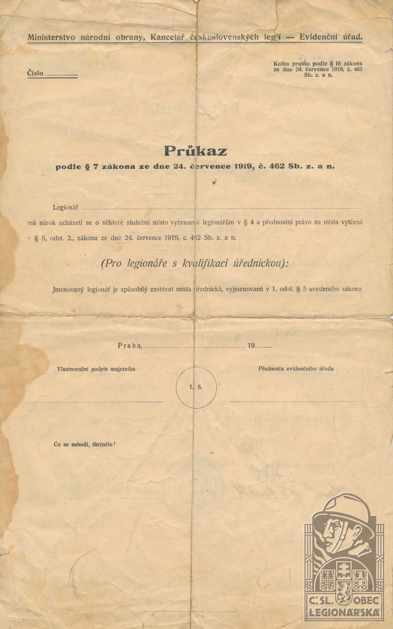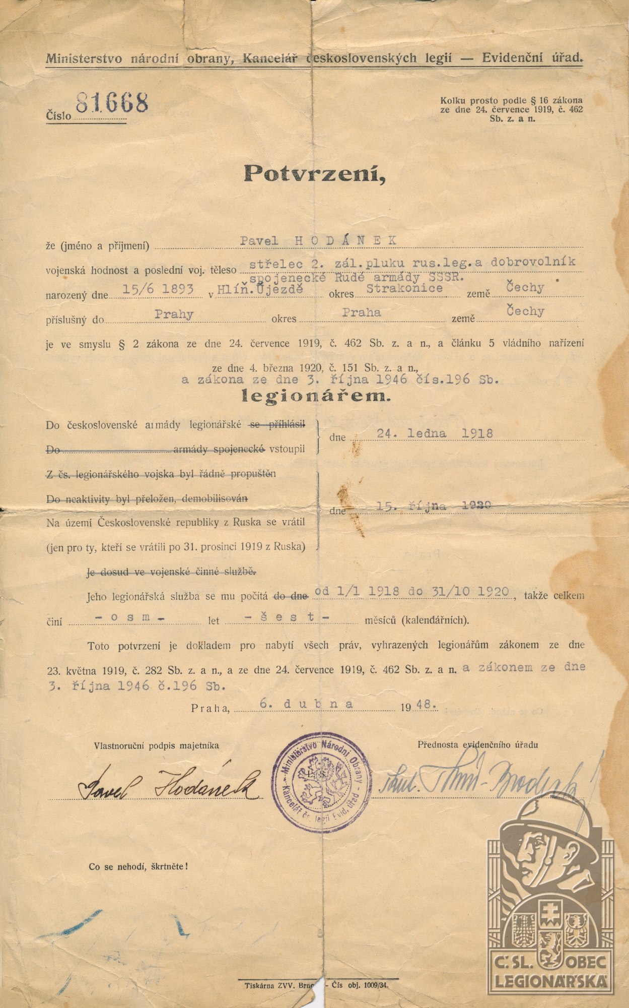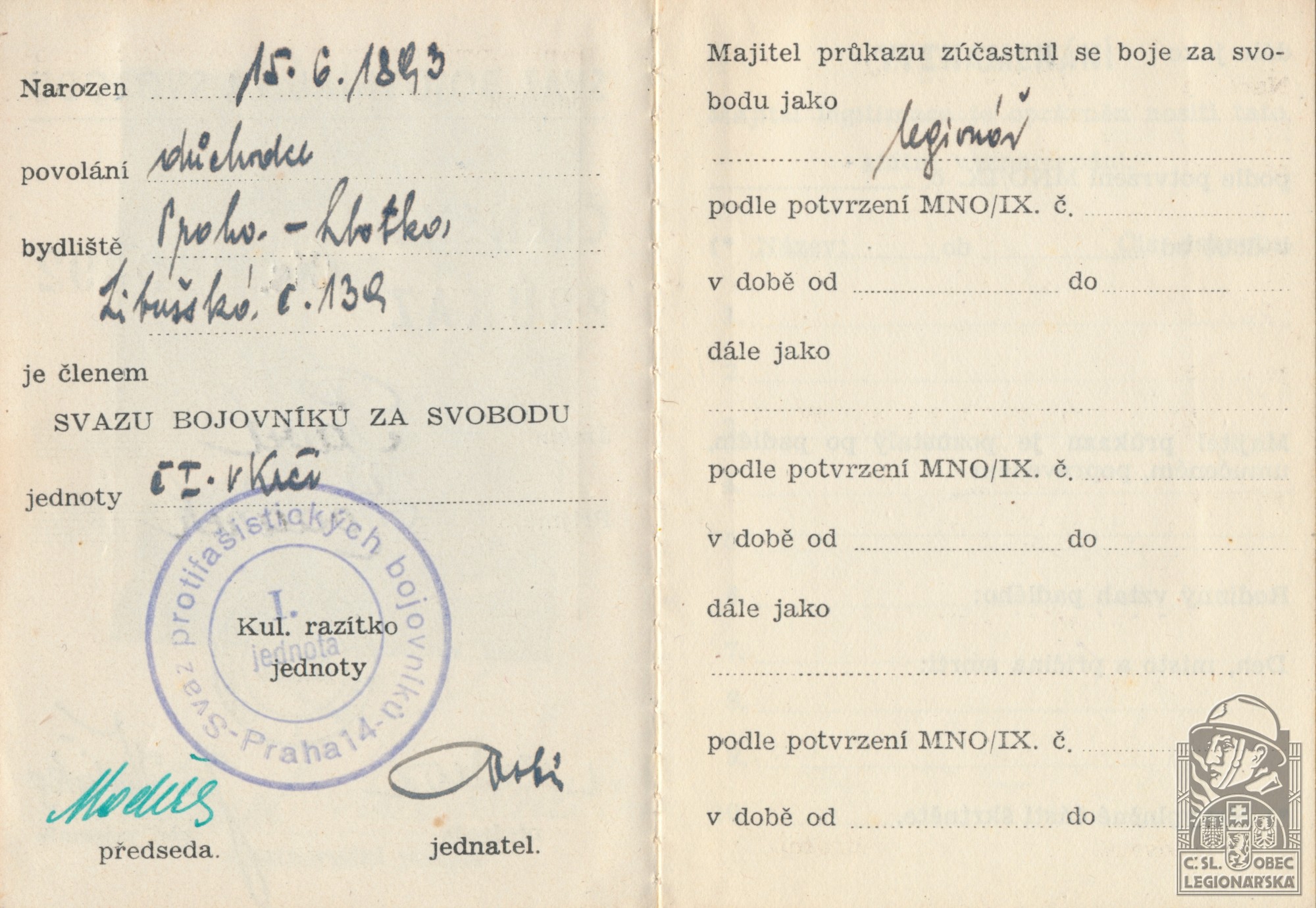 Zdroj informací: legionářský poslužný spis osobní karta legionáře
