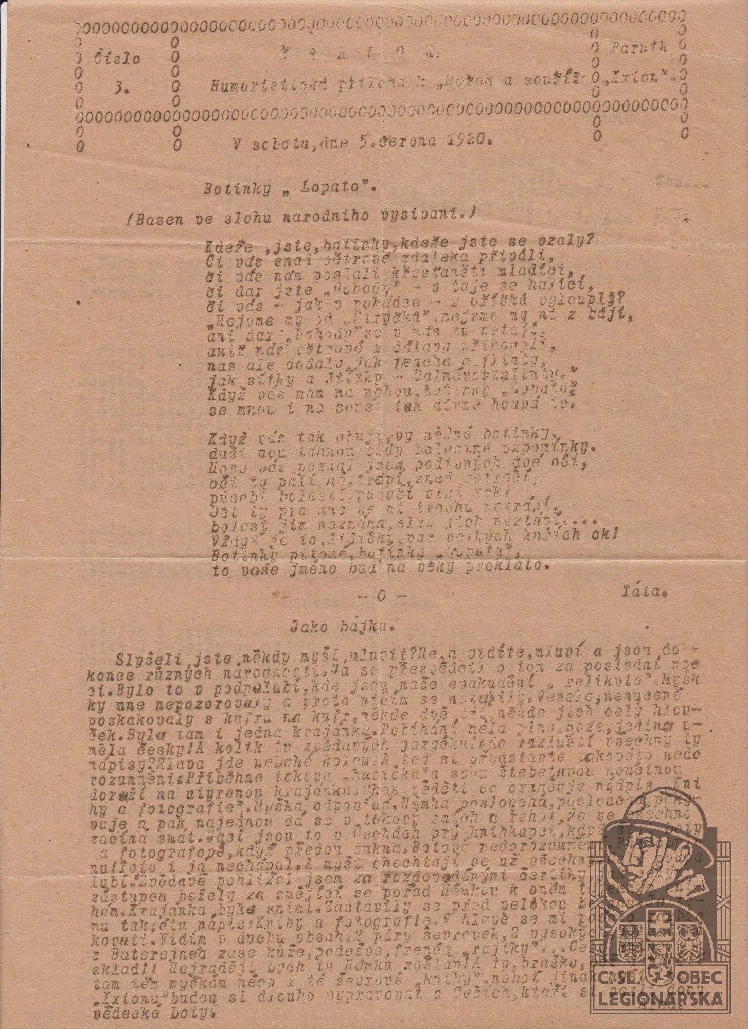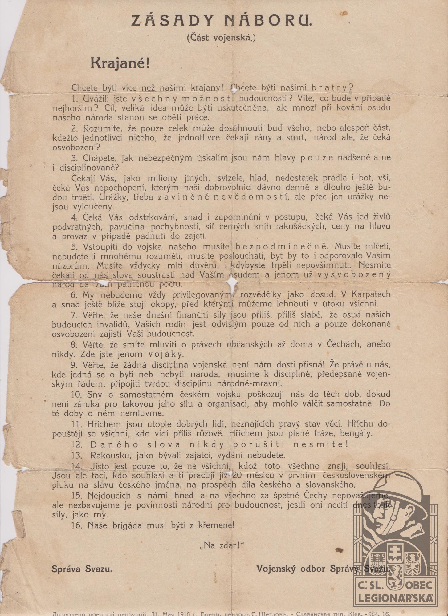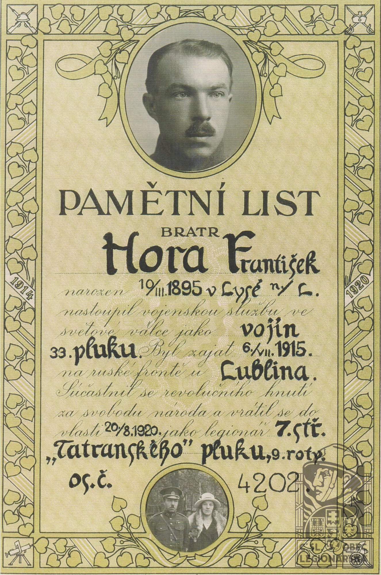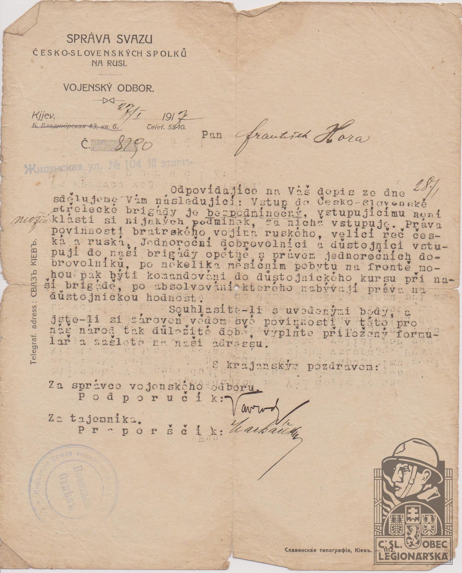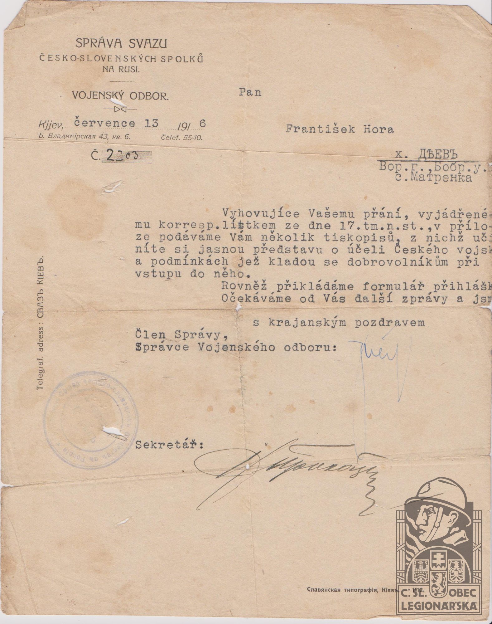Datum podání přihlášky do legií:6.1916