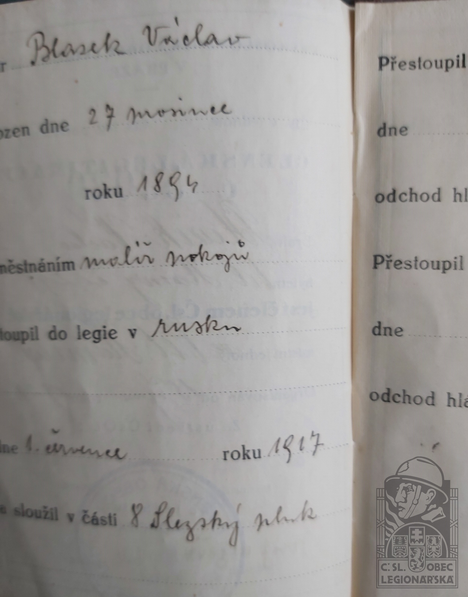 Zdroj informací: legionářský poslužný spis osobní karta legionáře