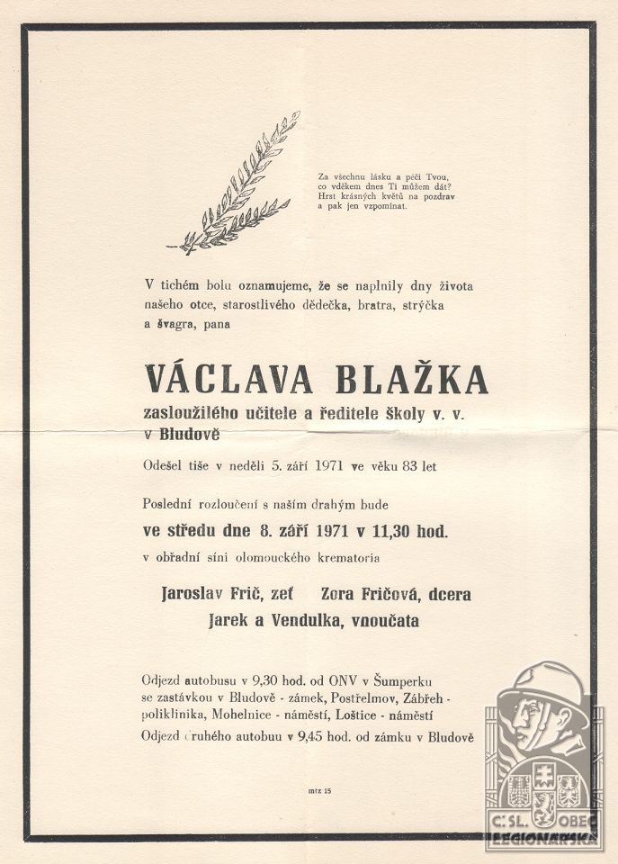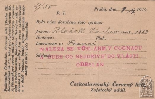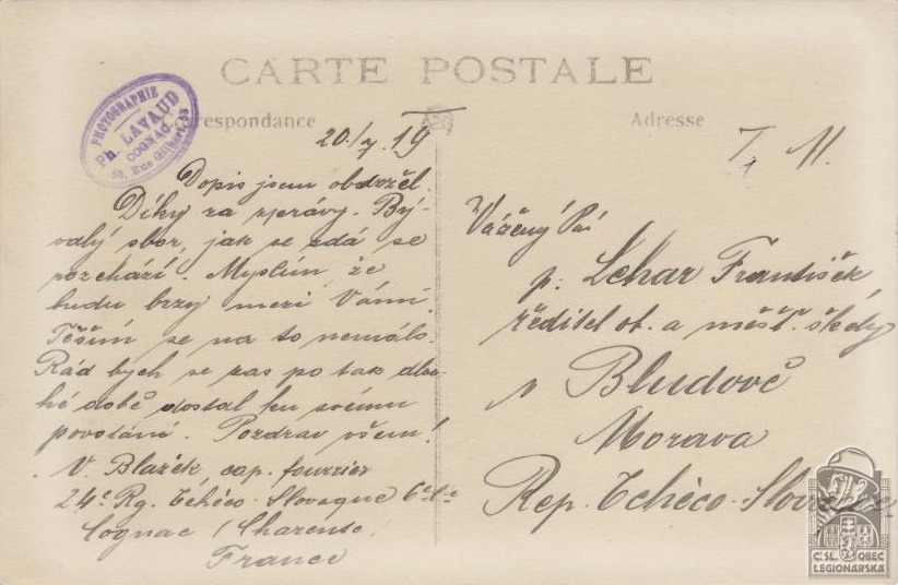 Jednotka v době zařazení:24.p.pl. ( Čs. legie v Francii )