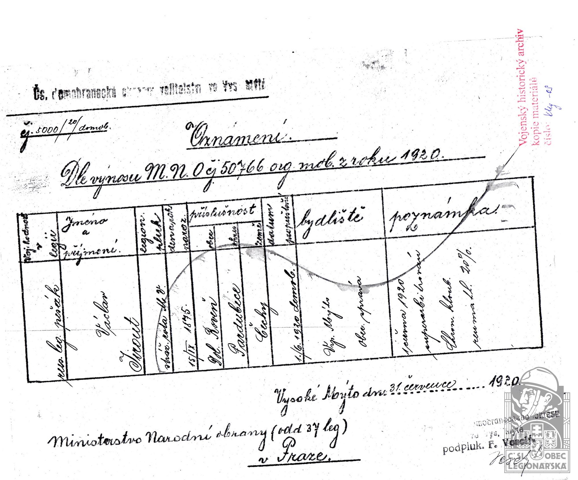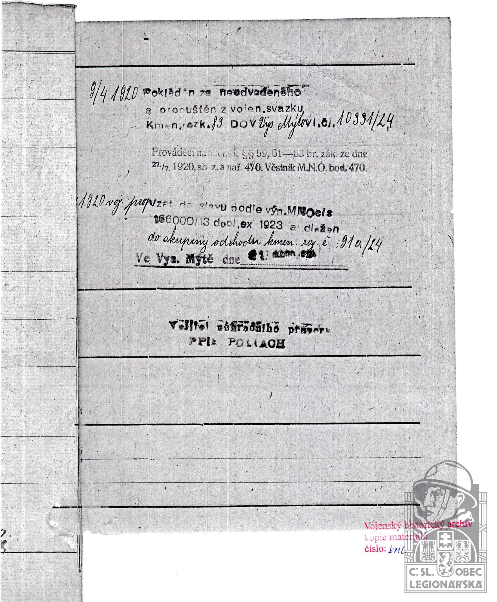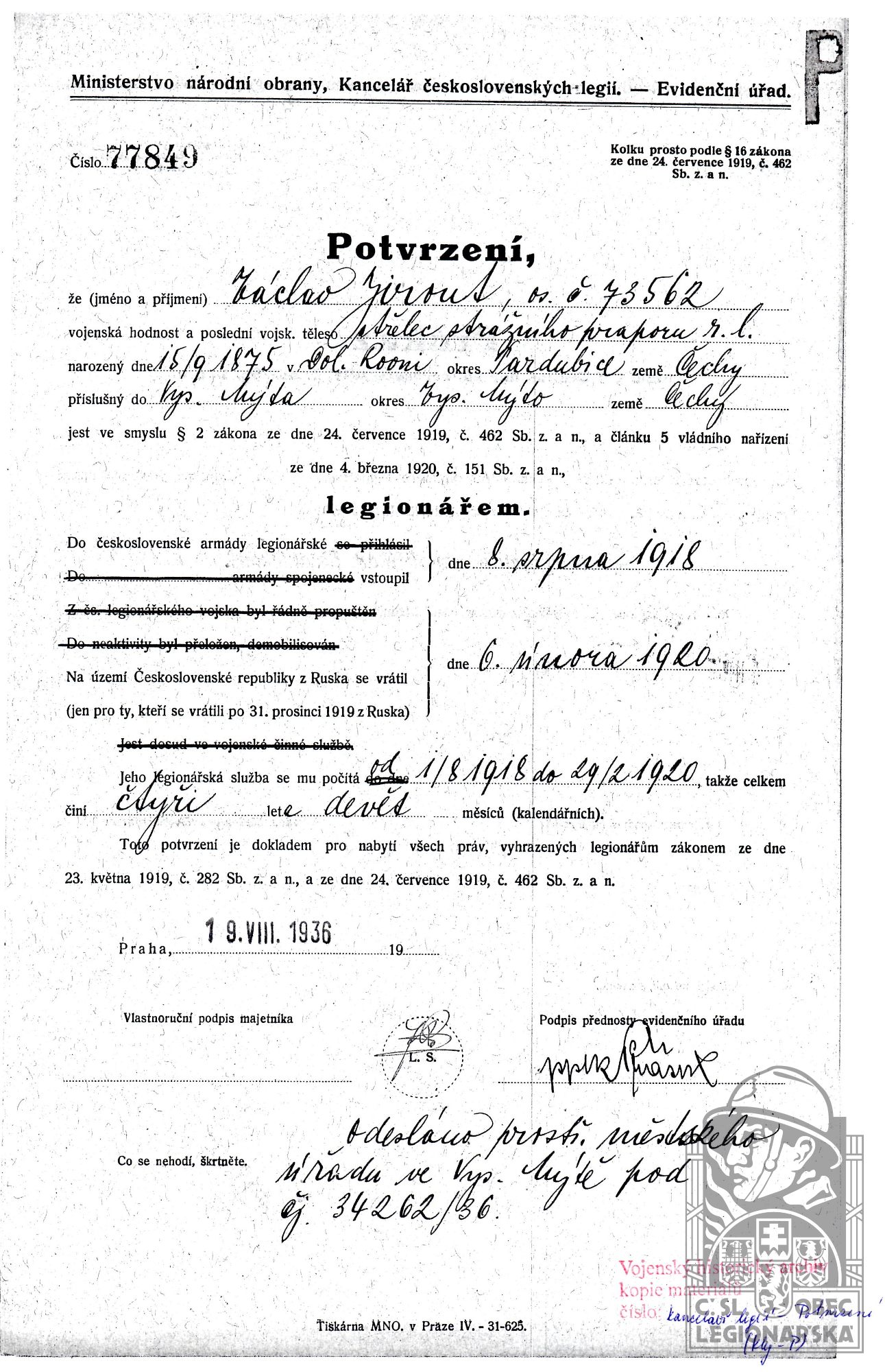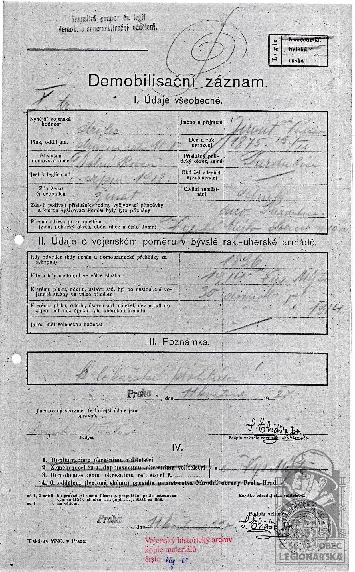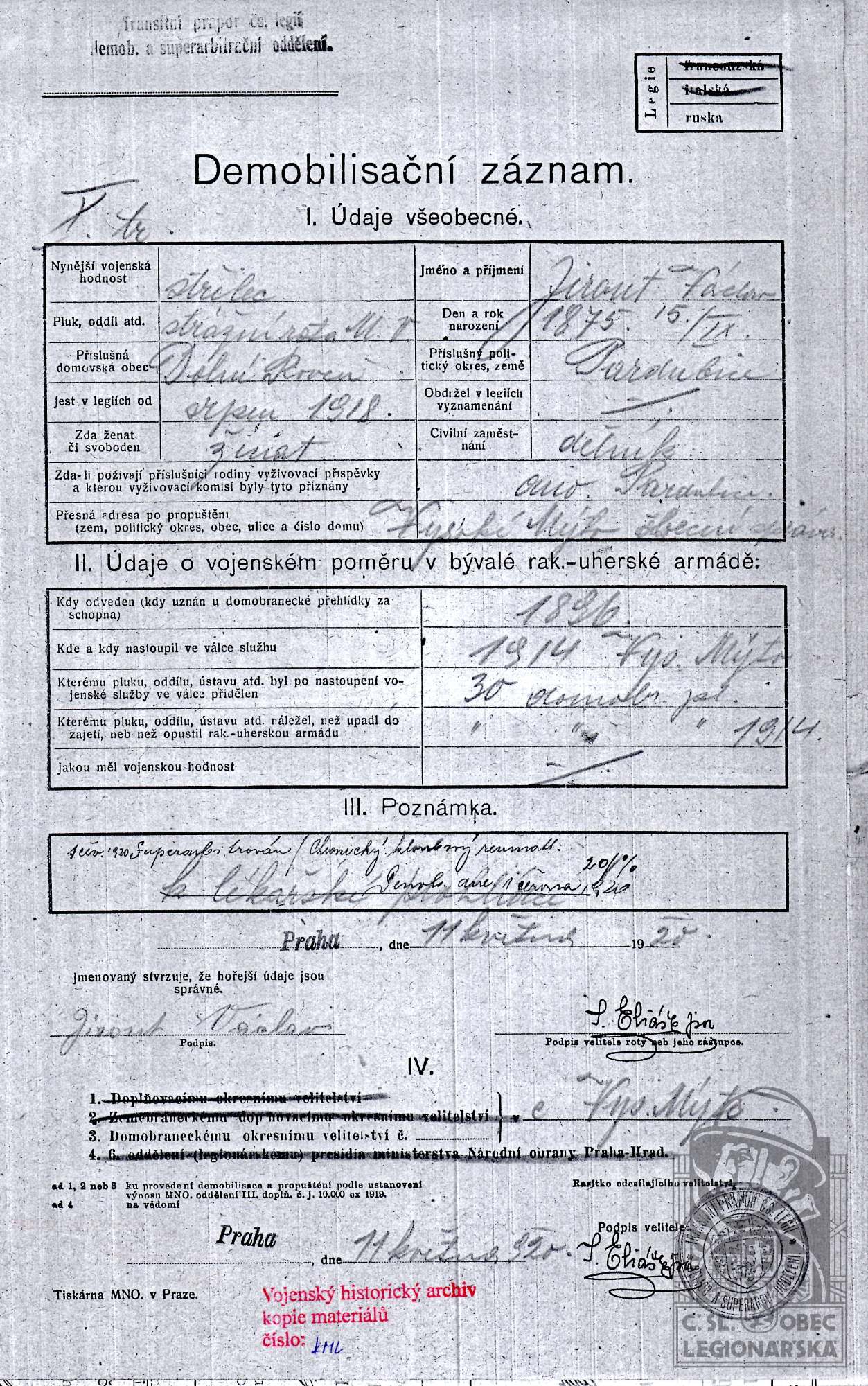 Konec v legiích:1.6.1920 ( Demobilizován )