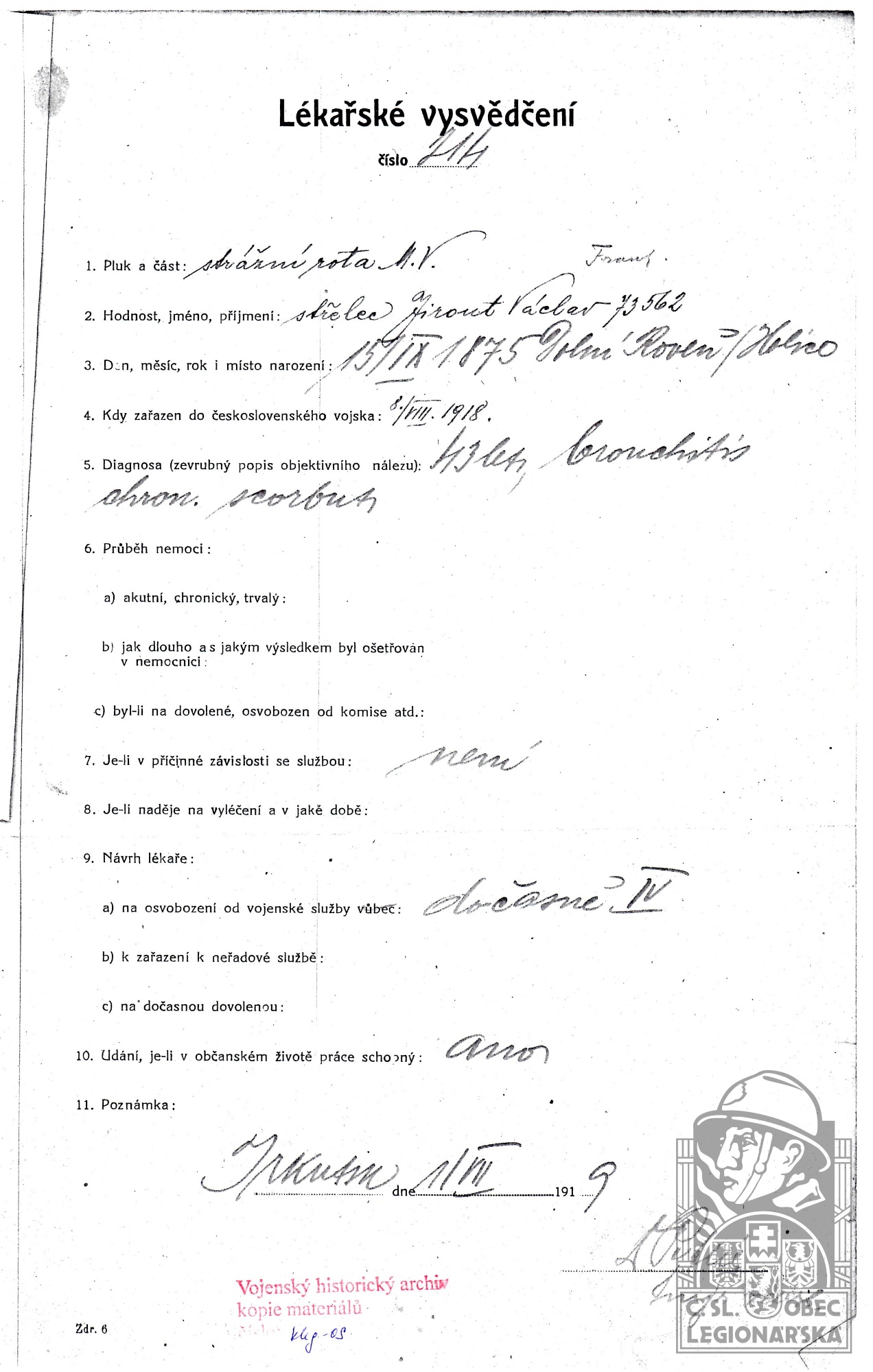 Jednotka v době zařazení:stráž.rota ( Čs. legie v Rusku )