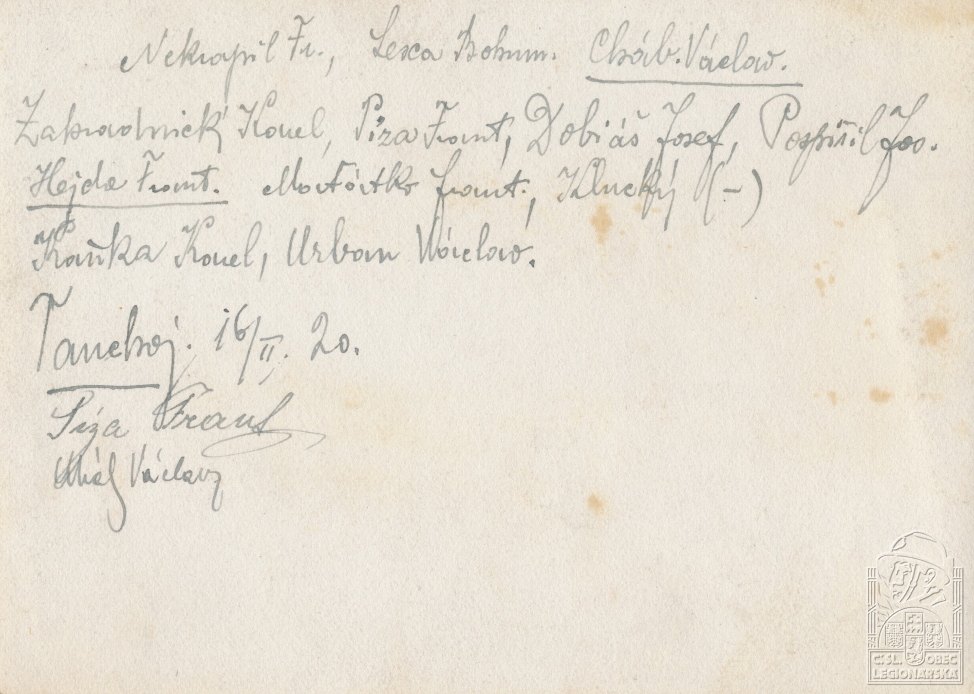 Zdroj informací: legionářský poslužný spis osobní karta legionáře