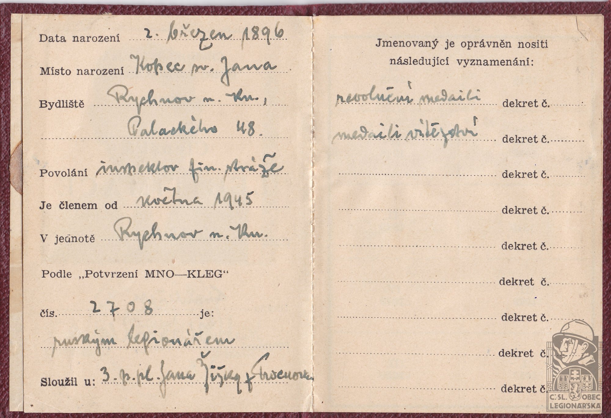 Zdroj informací: legionářský poslužný spis osobní karta legionáře