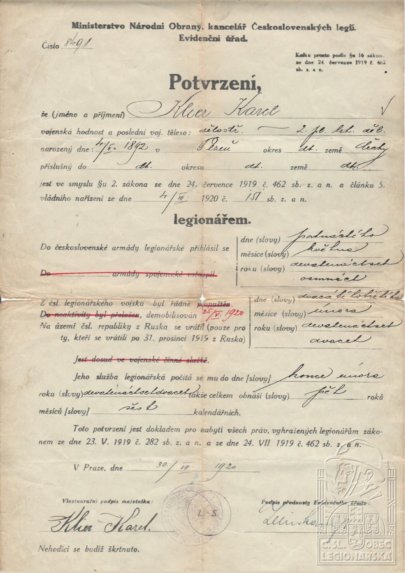 Konec v legiích:3.6.1920 ( Demobilizován )