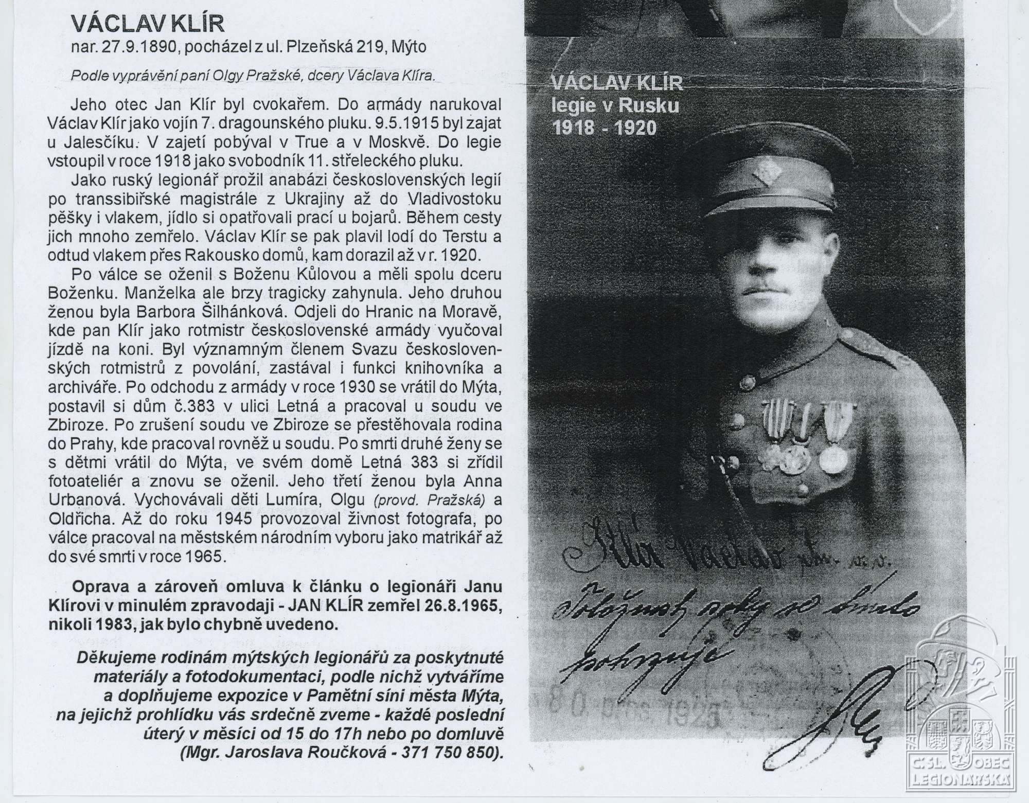 Zdroj informací: legionářský poslužný spis osobní karta legionáře