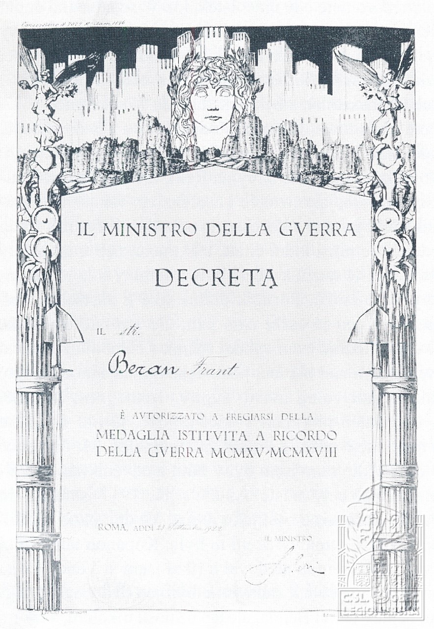 Jednotka v době zařazení:33.p.pl. ( Čs. legie v Itálii )