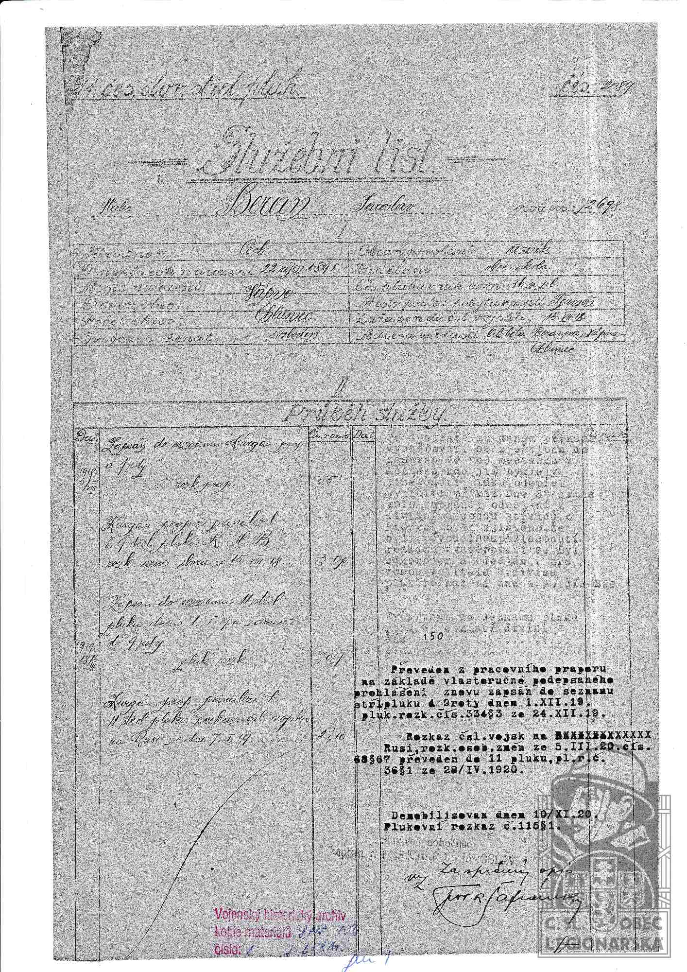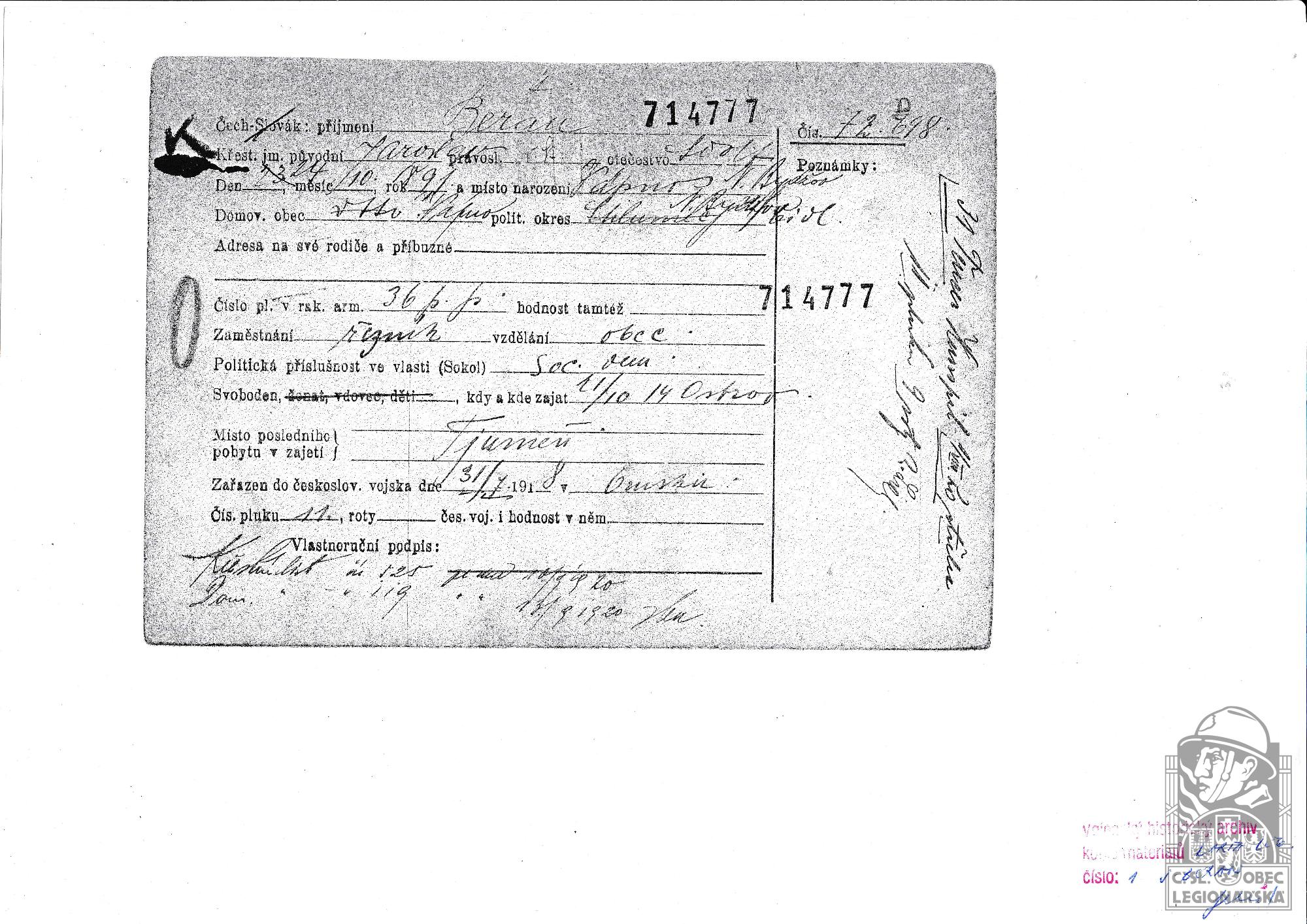 Jednotka v době zařazení:11.stř.pl. ( Čs. legie v Rusku )