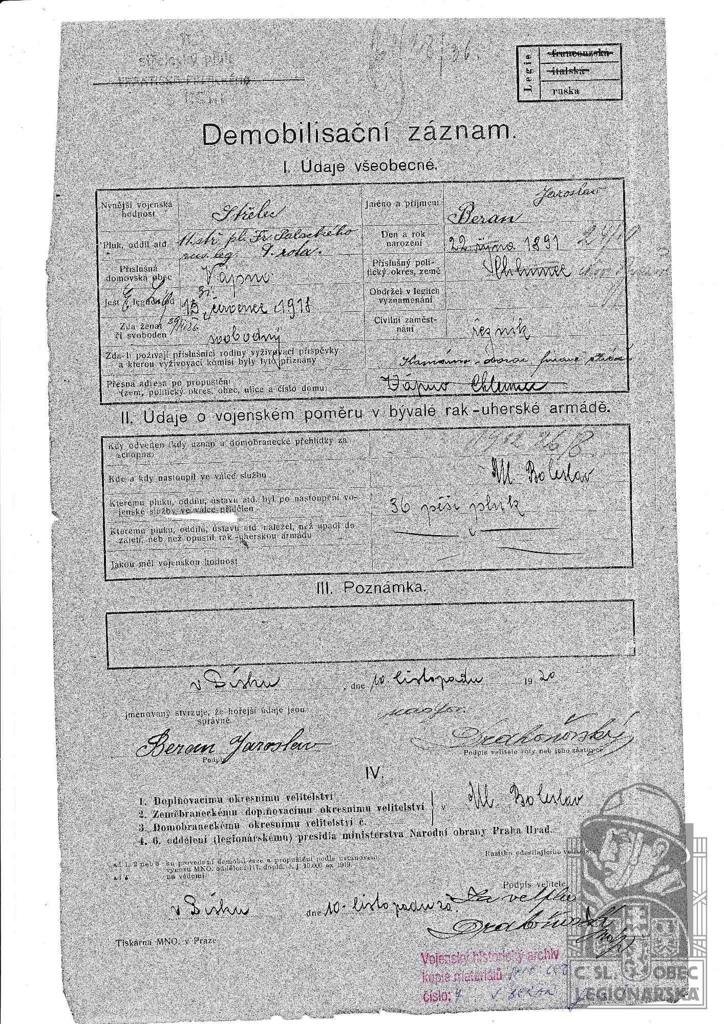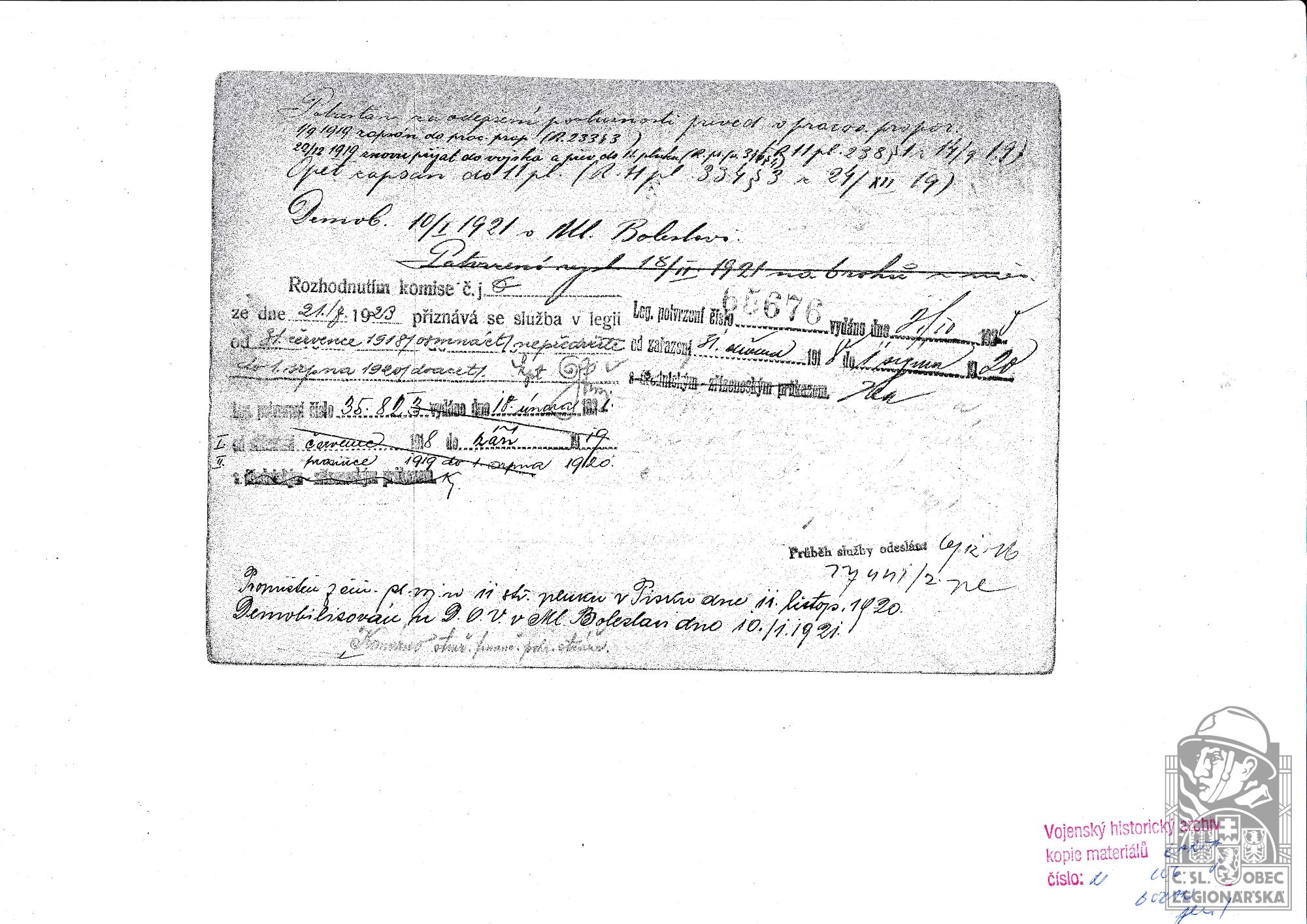Konec v legiích:10.1.1921 ( Demobilizován )