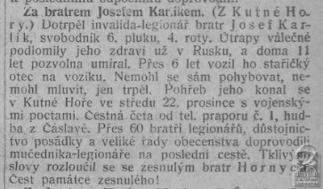 Ruský legionář Josef Karlík zemřel 11 let od návratu z Ruska , po strašlivém utrpení posledních dnů života, v náručí své matky v neděli 20.12.1931 v 10:30. Byl pochován s vojenskými poctami 22.12.1931 v Kutné Hoře.
