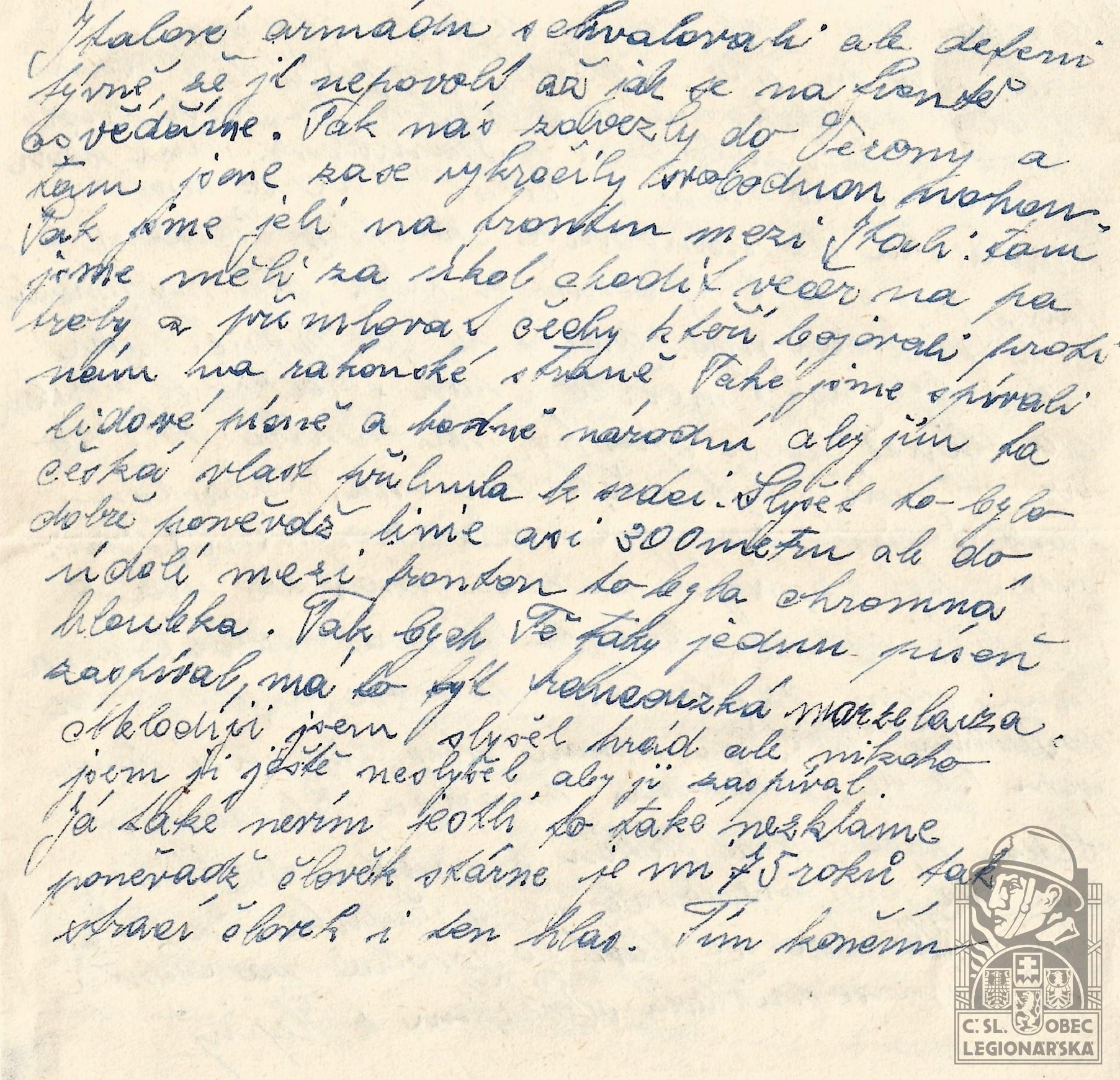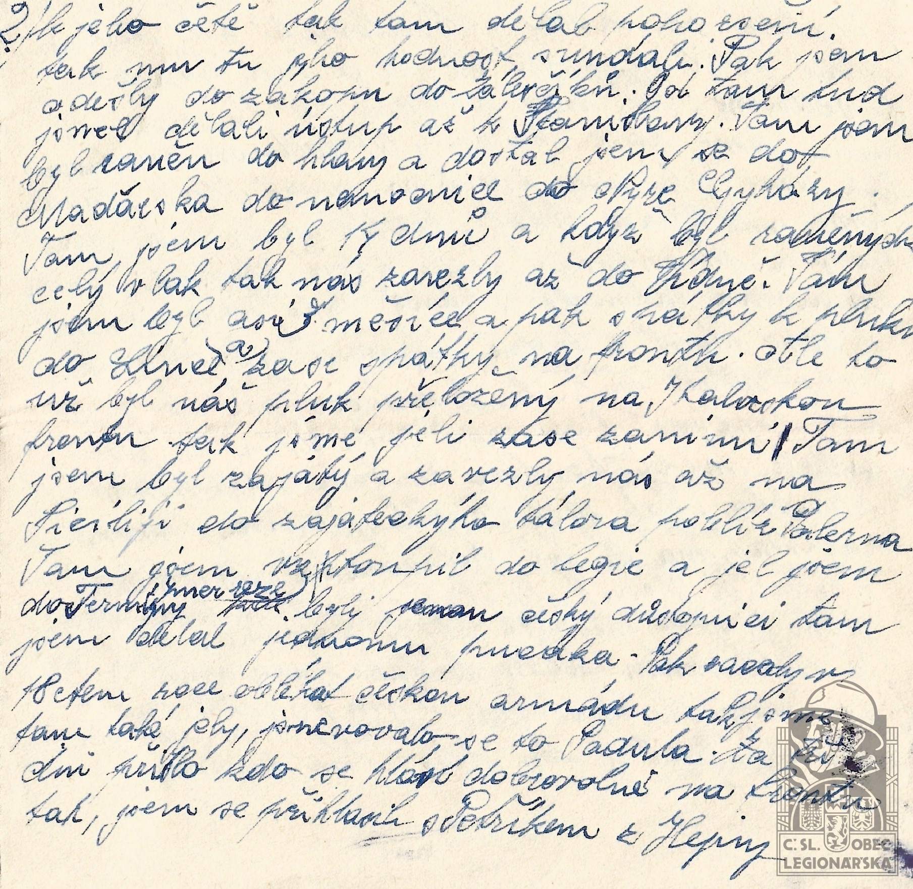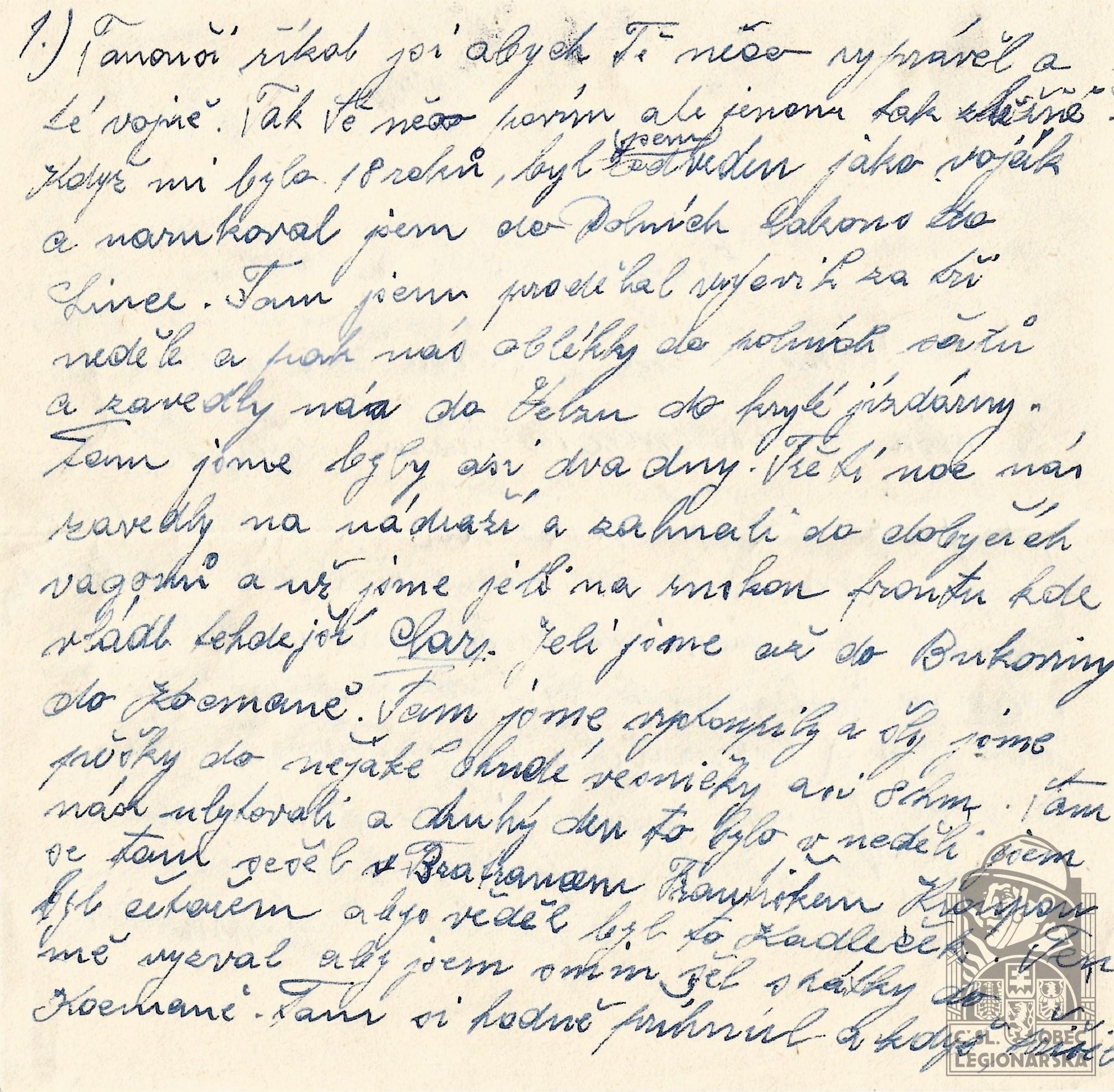 Životopis:„Když mi bylo 18 let, byl jsem odveden jako voják a narukoval jsem do Horních Rakous do Lince. Tam jsem prodělal výcvik po dobu 3 týdnů a pak nás oblékli do polních šatů a zavedli nás do Welsu do kryté jízdárny. Tam jsme byli asi dva dny. Třetí noc nás zavedli na nádraží a zahnali do dobytčích vagonů. Už jsme jeli na ruskou frontu, kde vládl tehdejší car. Jeli jsme až do Bukoviny do Kicmaně. Tam jsme vystoupili a šli jsme pěšky do nějaké chudé vesničky asi 8 km, kde nás ubytovali. Druhý den, v neděli, jsem se tam sešel s bratrancem Františkem Kroupou, který byl četařem a věděl, kdo je Kadleček. Ten mě vyzval, abych s ním šel zpátky do Kicmaně, kde si hodně přihnul. Když přišel k jeho četě, dělal tam pohoršení, a tak mu tu jeho hodnost sundali. Pak jsme odešli do zákopu do Zališčik. Odtamtud jsme dělali ústup až k Stanislavu (dnes Ivano-Frankivsk), tam jsem byl raněn do hlavy a dostal jsem se do maďarské nemocnice v Nyiregyházy. Tam jsem byl 14 dní a když byl raněných celý vlak, zavezli nás až do Vídně. Tam jsem byl asi měsíc a pak zpátky k pluku do Lince a znovu na frontu. Ale to už byl náš pluk přeložen na italskou frontu, tak jsme jeli zase za nimi. Tam jsem byl zajat a zavezli nás až na Sicílii do zajateckého tábora poblíž Palerma. Tam jsem vstoupil do legie a jel jsem do Terminy Imerese, kde byli jenom čeští důstojníci. Pak začali v 18tém roce někde oblékat českou armádu, a tak jsme také jeli. Jmenovalo se to Padula. Za tři dny přišlo, kdo se hlásí dobrovolně na frontu, a tak jsem se přihlásil s Petříkem z Hejné. Italové armádu schvalovali, ale deferovali týdně, že ji nepovolí, až se na frontě osvědčíme. Tak nás zavezli do Verony, a tam jsme zase vykročili svobodnou nohou. Pak jsme jeli na frontu mezi Italy, kde jsme měli za úkol chodit večer na patrolu a přemlouvat Čechy, kteří bojovali proti nám na rakouské straně. Také jsme jim zpívali lidové písně a hodně národní, aby jim ta česká vlast přilnula k srdci. Slyšet to bylo dobře, poněvadž jsme tvořili linii 300 m, ale do údolí mezi frontou to byla ohromná hloubka. Také bych ti jednu píseň zazpíval. Má to být francouzská Marseillaise, melodii jsem slyšel hrát, ale nikoho jsem nikdy neslyšel, aby ji zazpíval. Já také nevím, jestli tě nezklamu, poněvadž člověk stárne, je mi 75 let, takže člověk i hlas ztrácí. Tím končím.“ (Z dopisu bratrovi a sestře do Ameriky, Čejkovy, 18.6.1972)