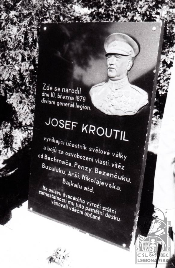 Životopis:Josef Kroutil se narodil 10. března 1879 do sedlácké rodiny v Koválovicích (u Tištína, na Hané, tehdy okr. Přerov). Po vystudování třebíčského gymnázia úředničil u císařských drah v Třemešné u Krnova, kde se také šťastně oženil s místní německou rodačkou Adelheid Krentschker. Začátkem světové války nastoupil na východní frontu, kde v Sauči padl do ruského zajetí. Po smrti rakouského císaře Františka Josefa I. vstoupil dne 18. července 1917 jako poručík mezi české „dobrovolce“, později nazývané legie. Za své věrné služby byl postupně povyšován a oceňován (celkem 17 různých vyznamenání). Stal se jedním z hrdinů bitvy u Bachmače, účastnil se bitev v Penze, Bezenčuku, Buzuluku atd. Josef Kroutil byl blízkým spolupracovníkem francouzského generála Janina, zmocněnce čs. vlády a při známé transsibiřské anabázi se stal dočasným velitelem města Omsk. V dubnu 1920 velel největšímu transportu legionářů domů – loď S. S. America připravila domů téměř 6,5 tisíce osob. Sám v té době velel 4. československému střeleckému pluku Prokopa Holého, který tak bezpečně přivedl zpět do vlasti.