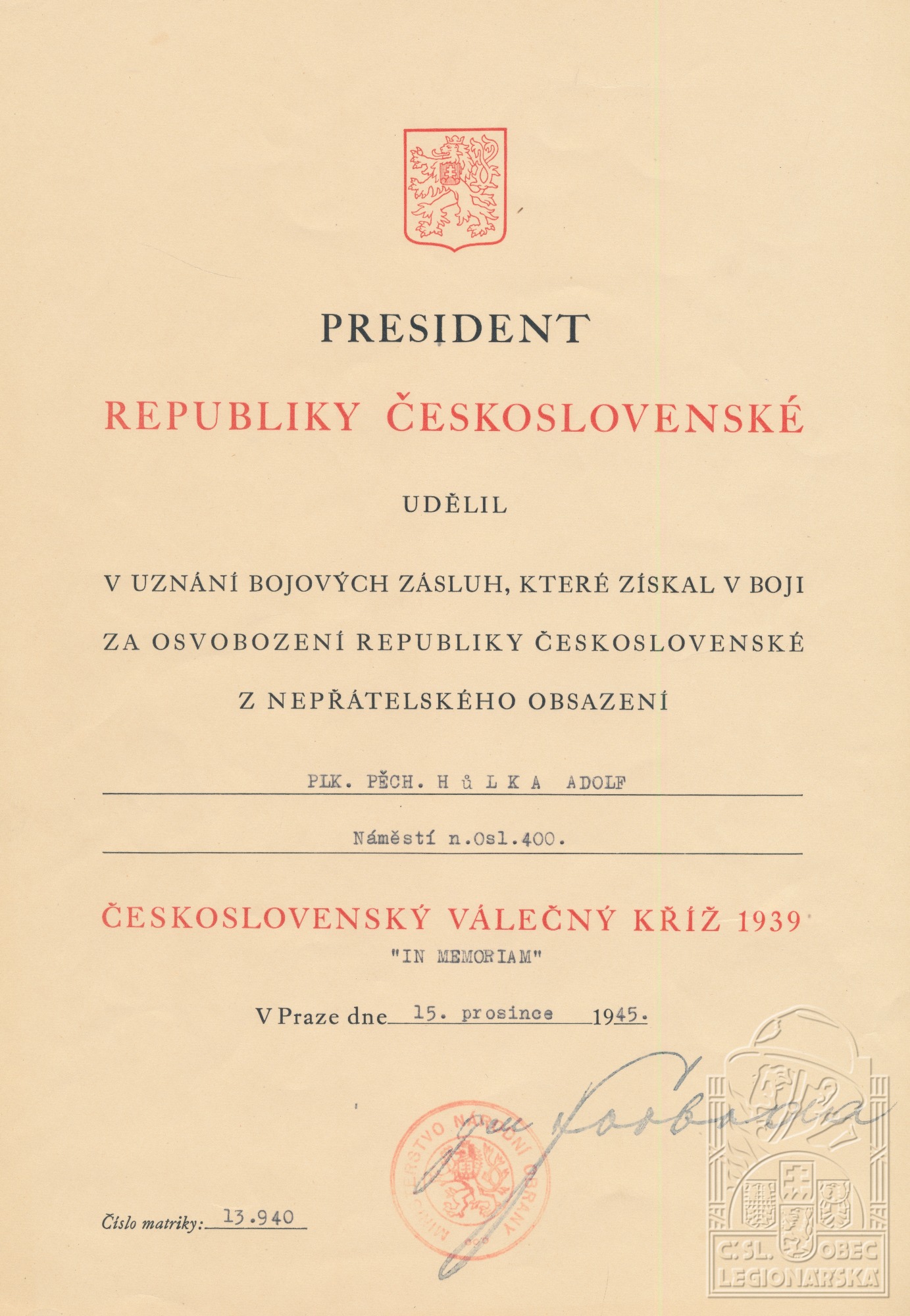 Konec v legiích:23.12.1919 ( Sloužil v čs. armádě po r. 1918 )