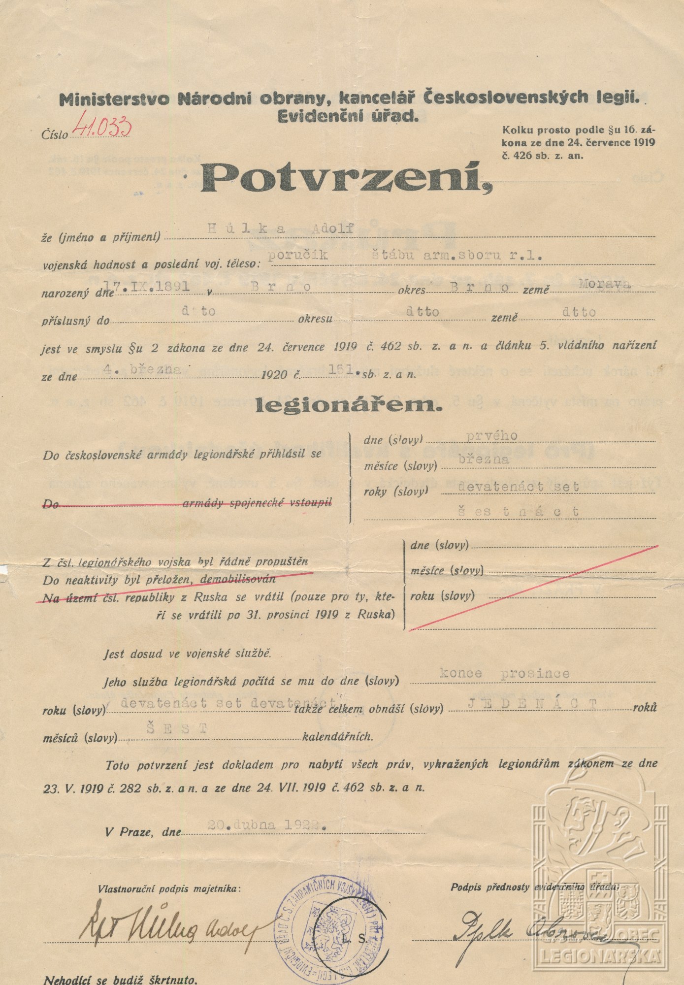 Datum podání přihlášky do legií:16.8.1916