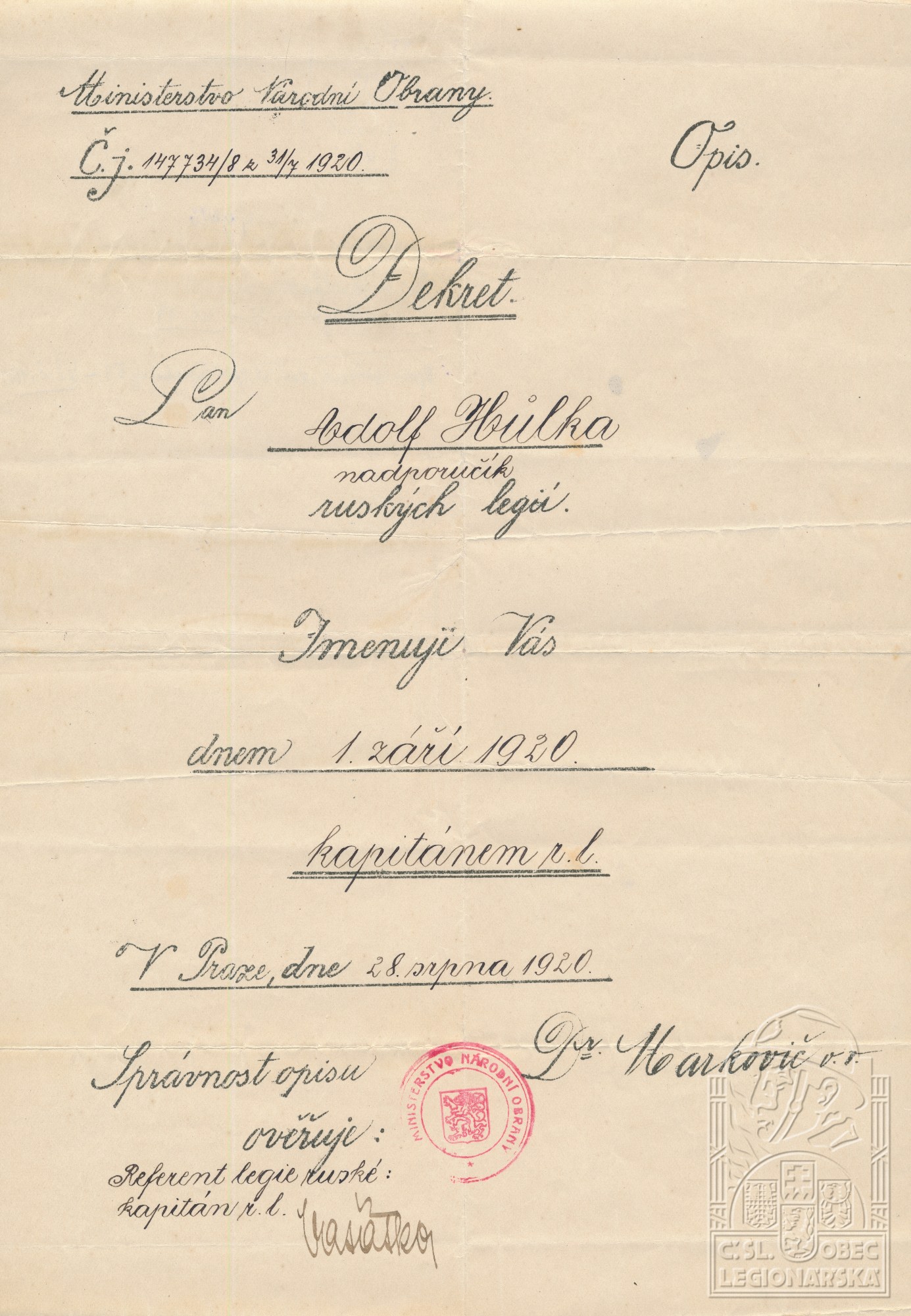 Poslední útvar v legiích:předseda pl. soudu arm. sboru