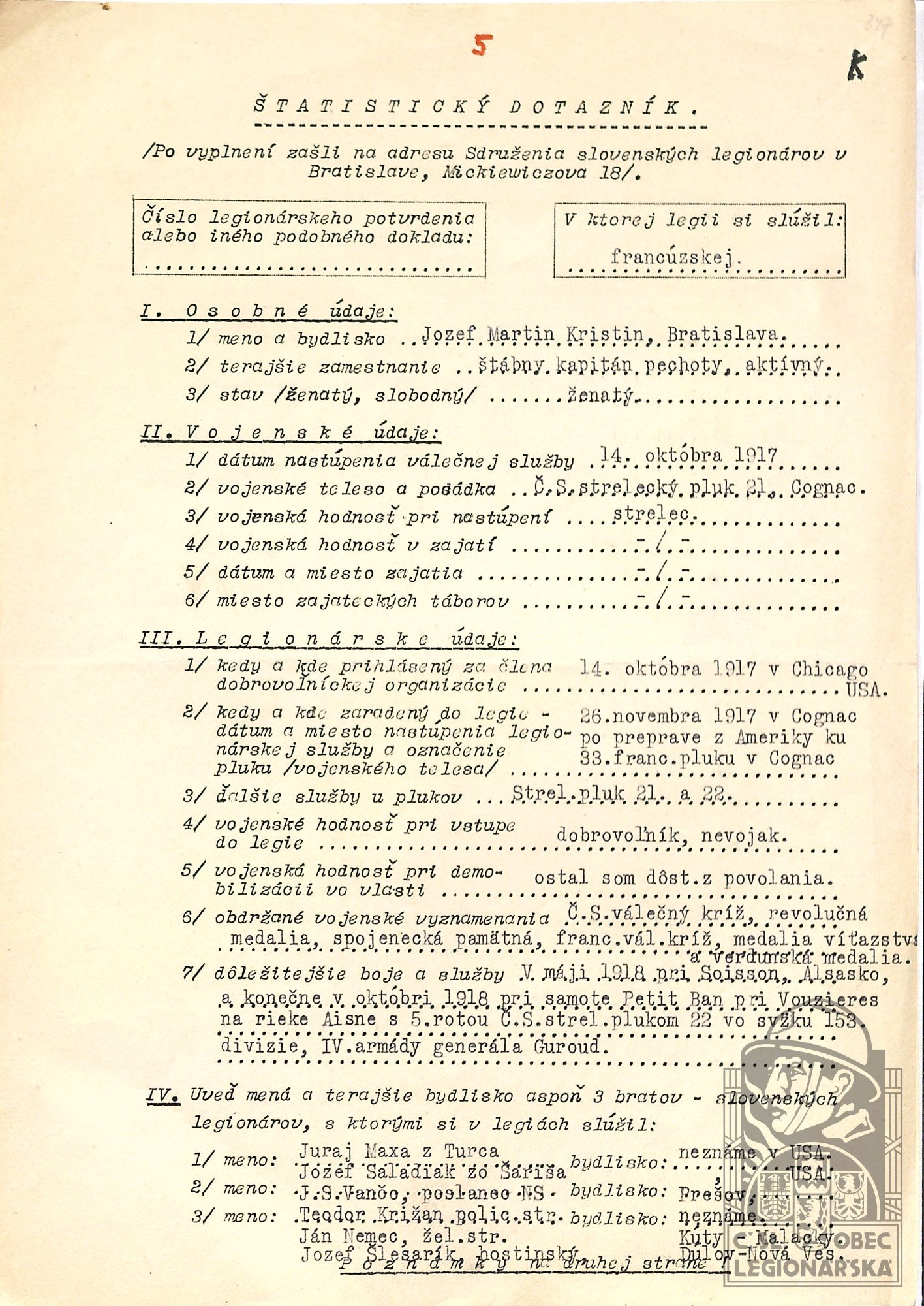 Zdroj informací: legionářský poslužný spis osobní karta legionáře