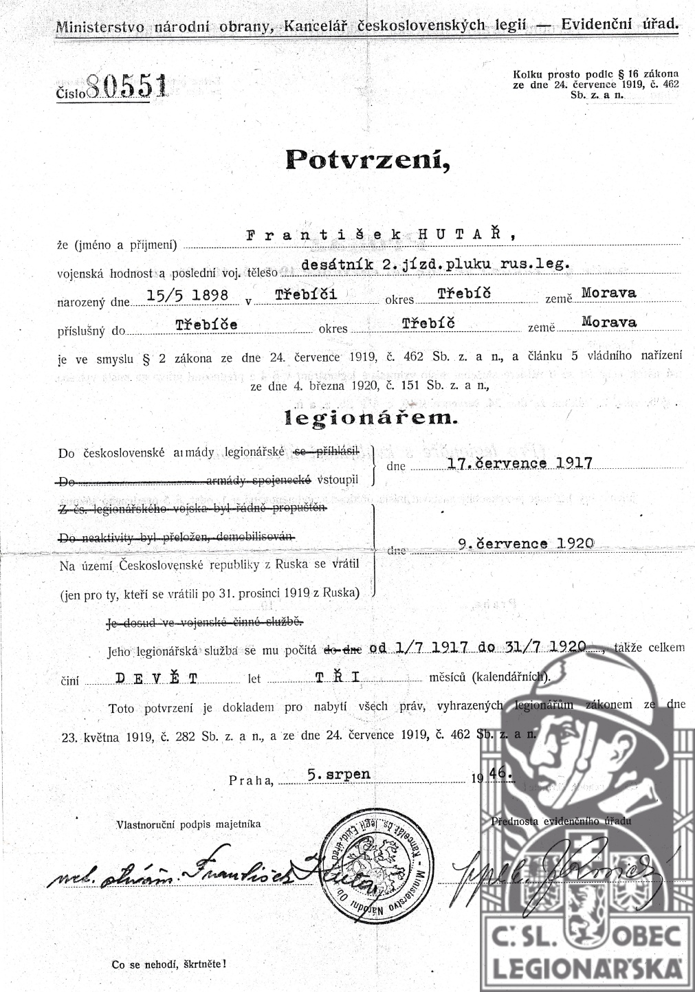 Konec v legiích:9.7.1920 ( Demobilizován )