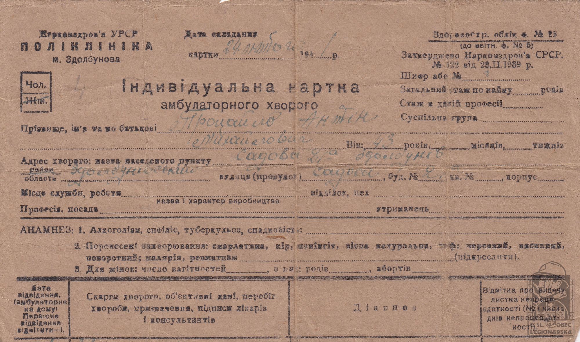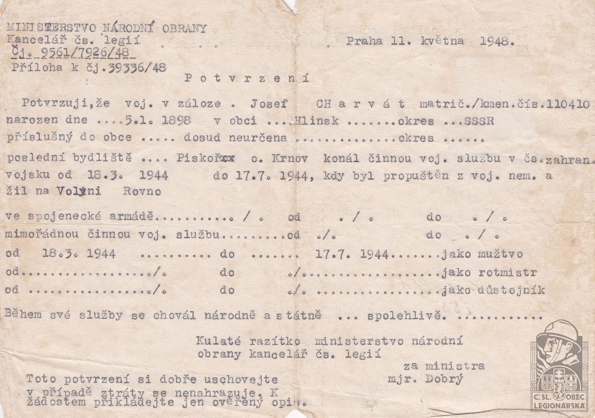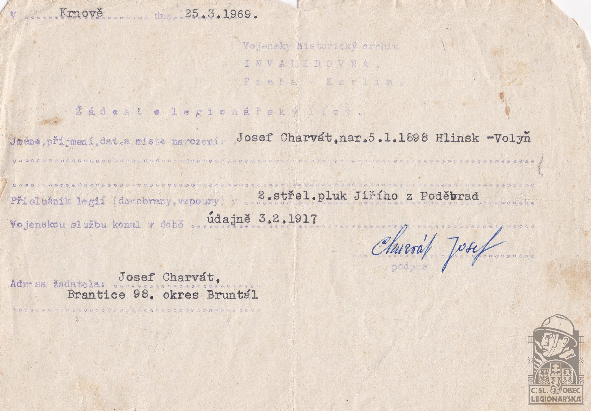Zdroj informací: legionářský poslužný spis osobní karta legionáře