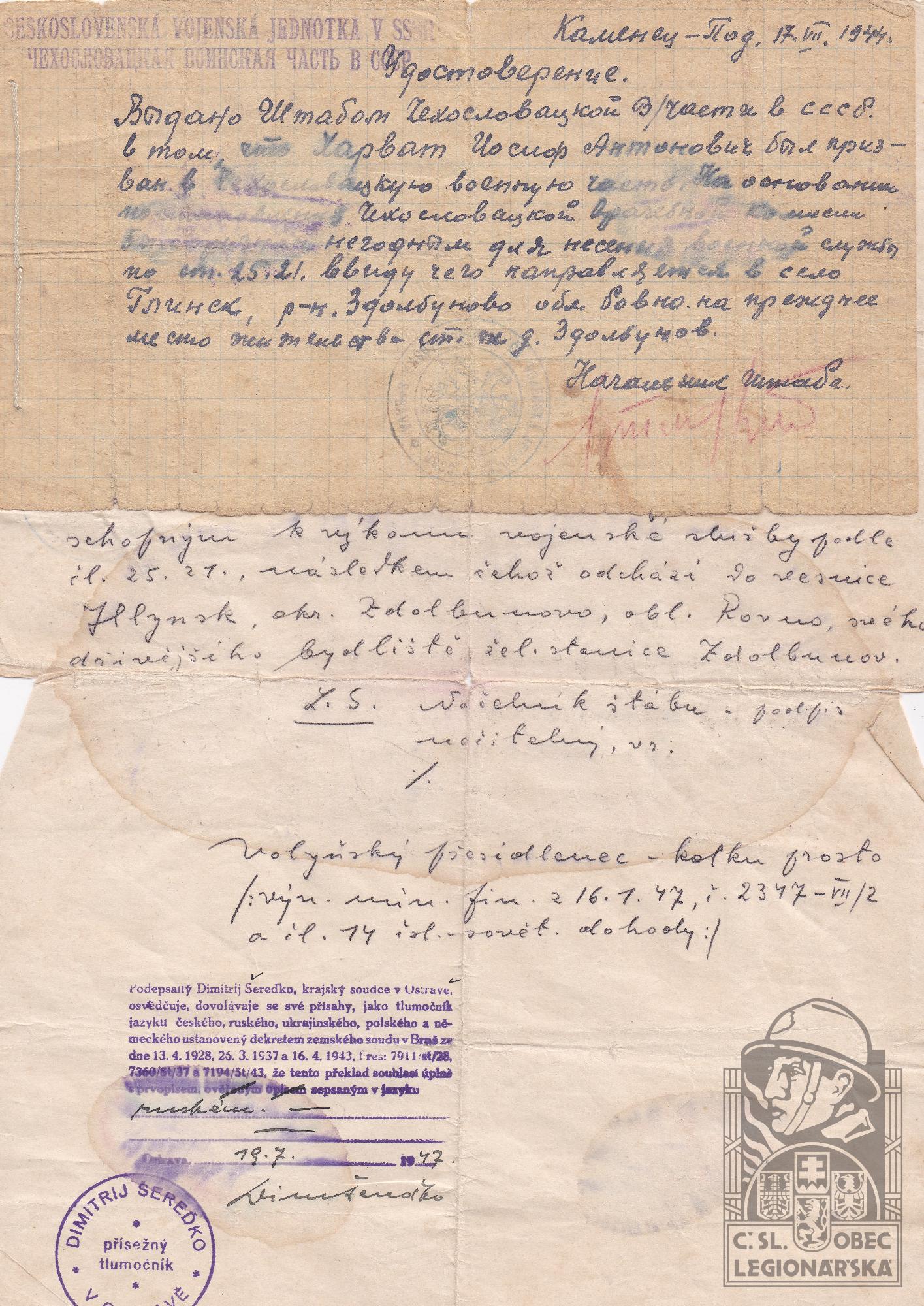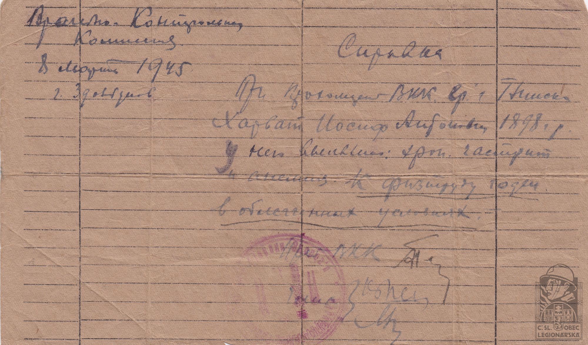 Jednotka v době zařazení:zál.pr. ( Čs. legie v Rusku )