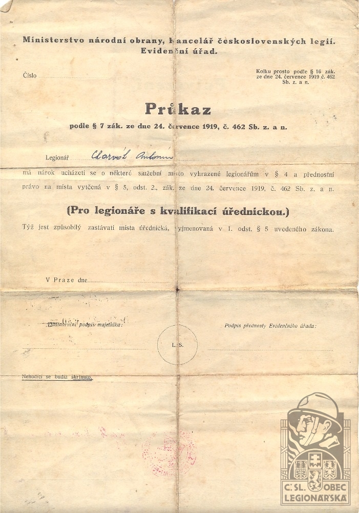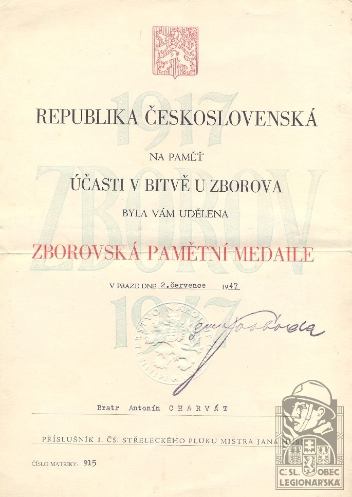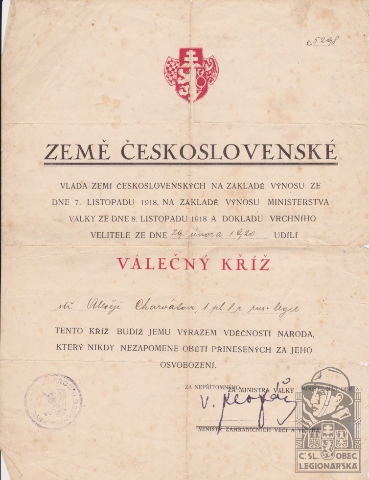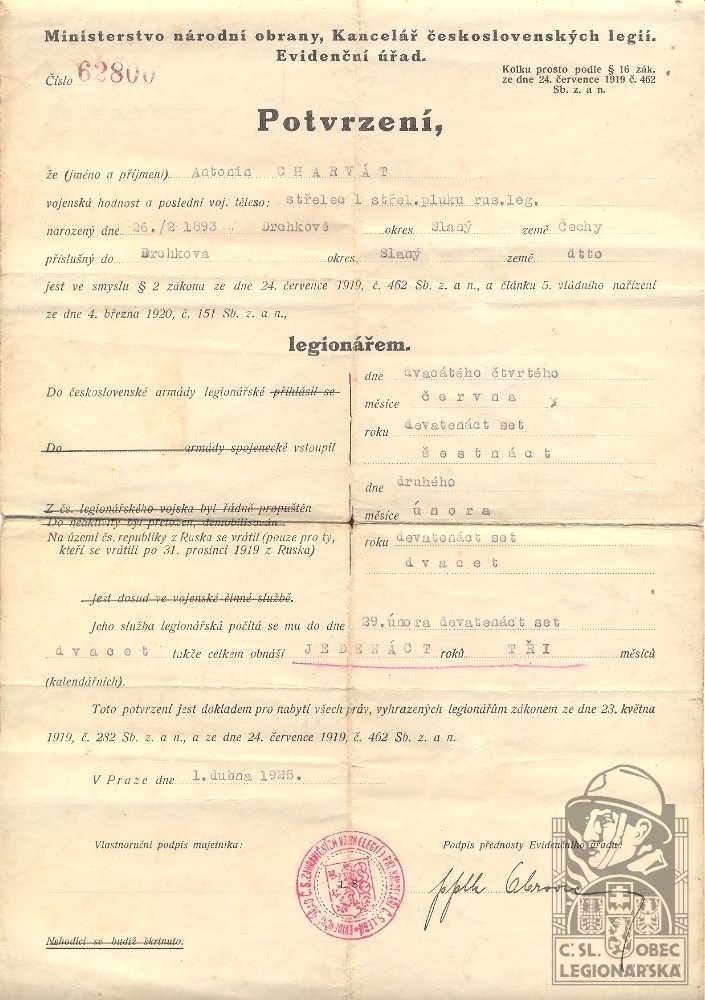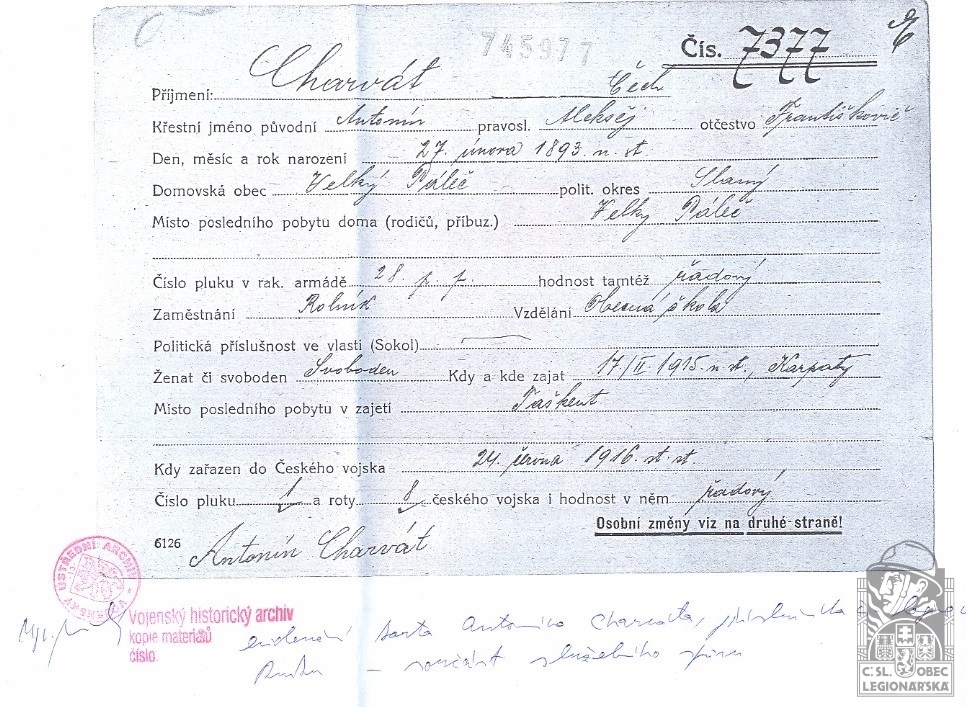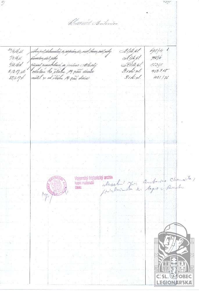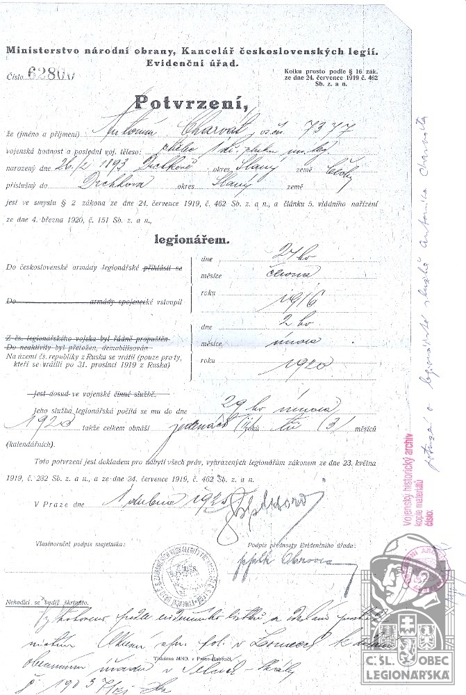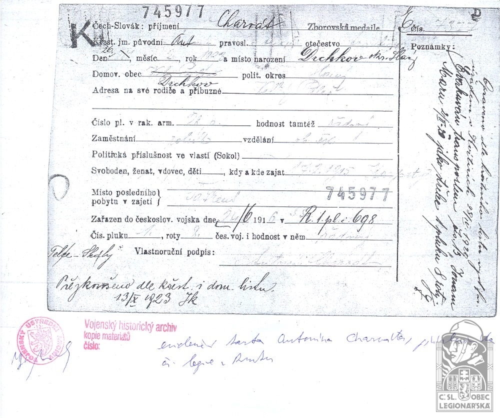 Zdroj informací: legionářský poslužný spis osobní karta legionáře