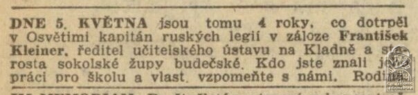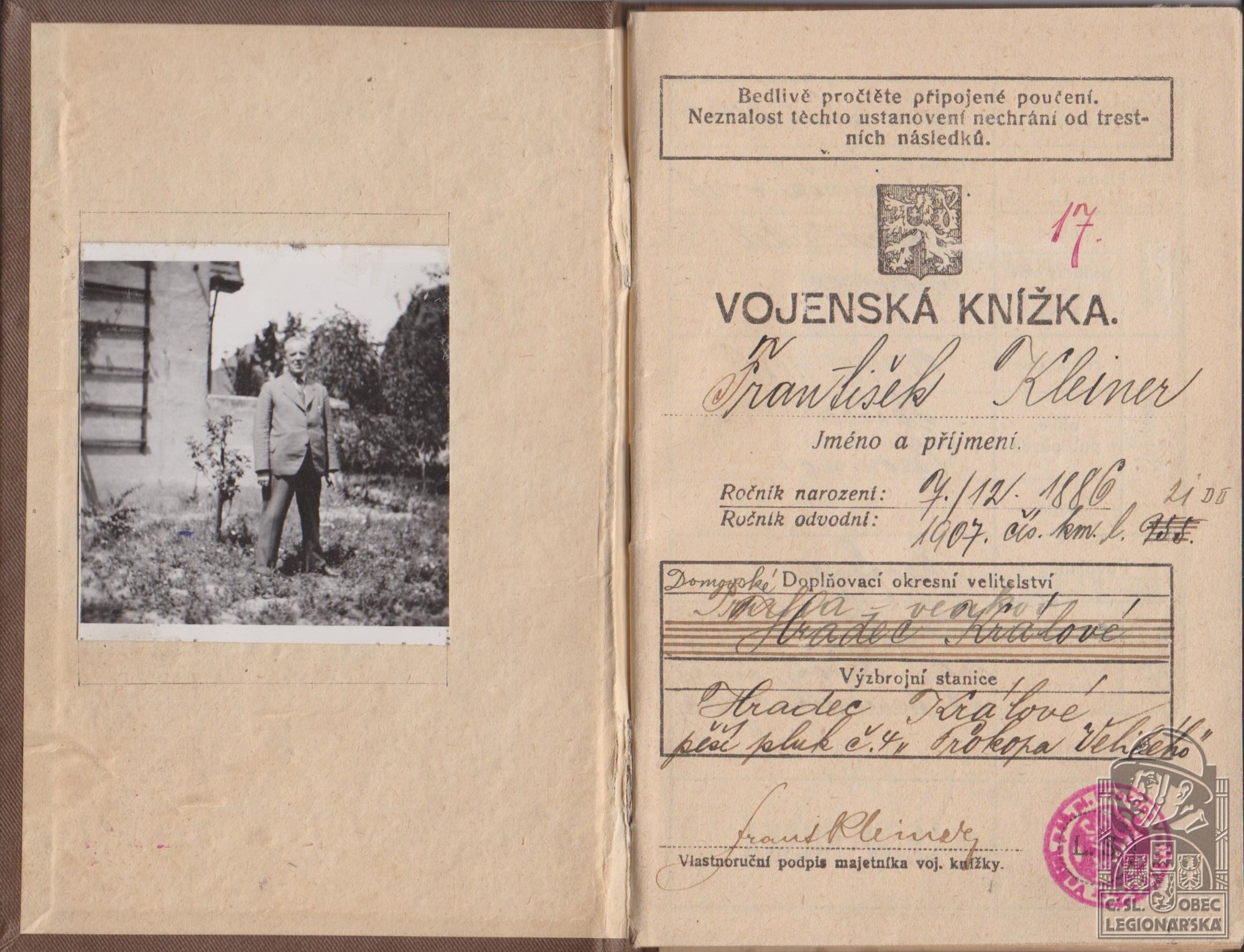 Životopis:František Kleiner se narodil 7.12.1886 v obci Police nad Metují. Vystudoval gymnázium v Rychnově nad Kněžnou a poté pracoval jako středoškolský profesor německého a českého jazyka. Na začátku války sloužil u rakousko-uherského 98. pěšího pluku jako poručík. Nedlouho po začátku války 8.9.1914 upadl do ruského zajetí u obce Ruská Rava. Do legie se přihlásil v Boborvě na Donu a od 14.3.1918 sloužil jako vojín u 5. střeleckého pluku. František Kleiner dosáhl poručické hodnosti a po návratu do ČSR demobilizoval.