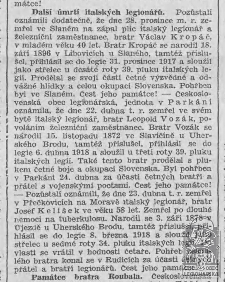Jednotka v době zařazení:39.stř.pl. ( Čs. legie v Itálii )