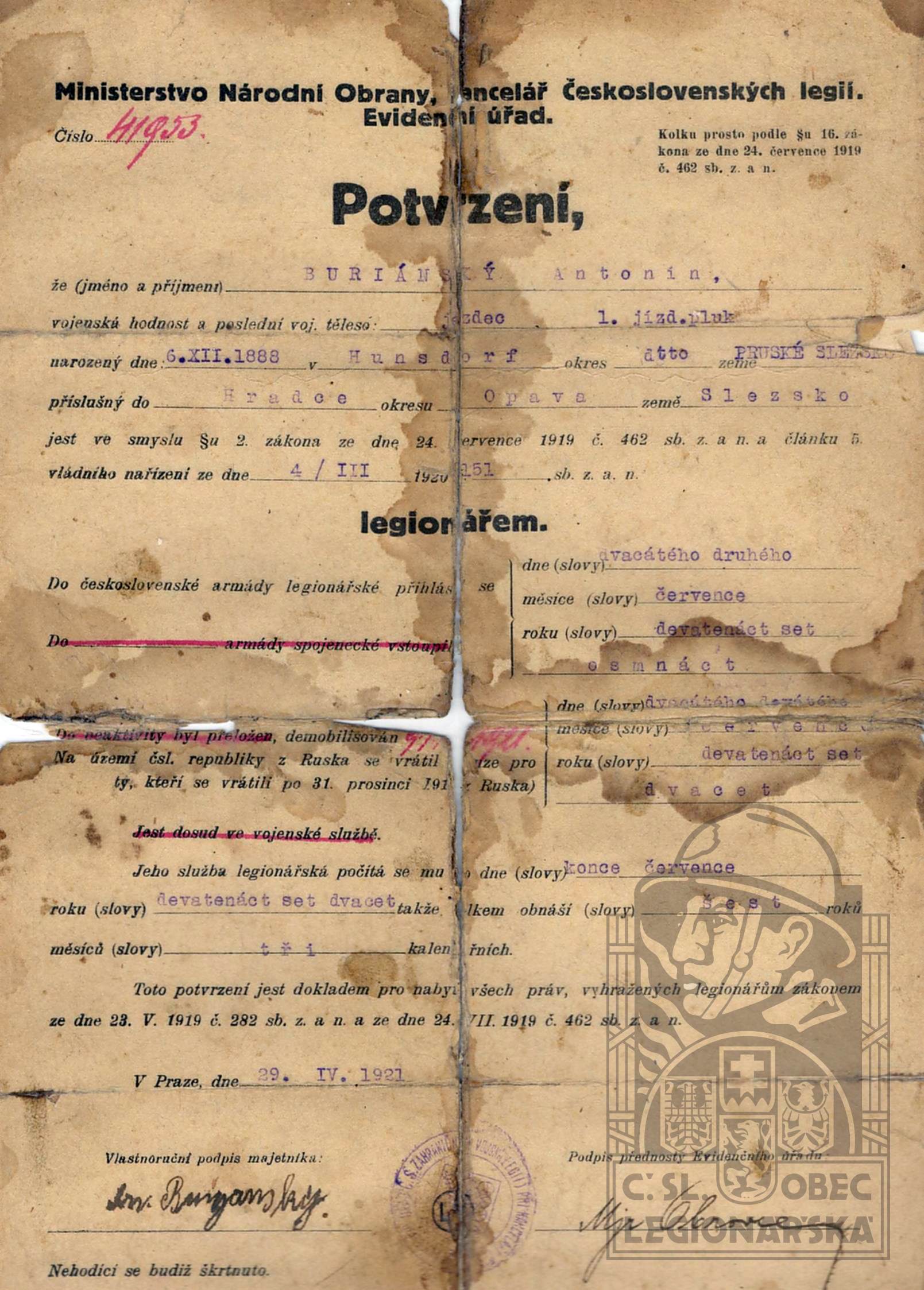 Zdroj informací: legionářský poslužný spis osobní karta legionáře