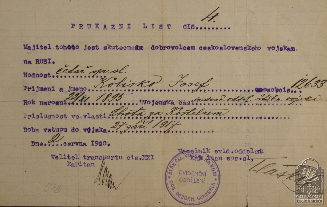 Jednotka v době zařazení:zál.pr. ( Čs. legie v Rusku )