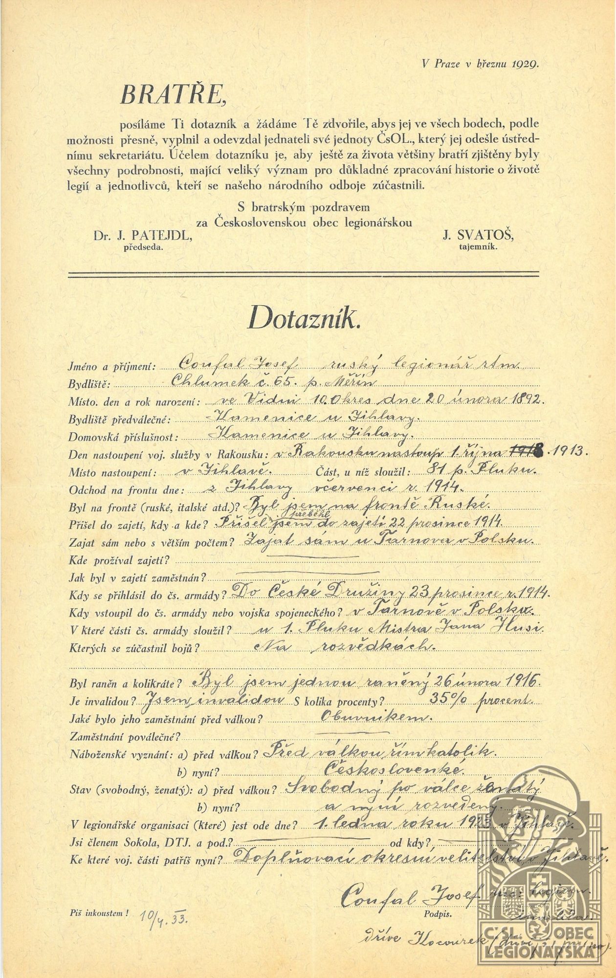 Zdroj informací: legionářský poslužný spis osobní karta legionáře Muzeum Velké Meziříčí, fond A9/1