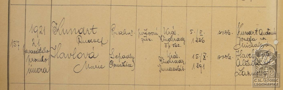 Poznámka:fotbalista Vinohradský S.K.; Oddán: 21.2.1921, manželka: Havlová Marie (*15.10.1891)