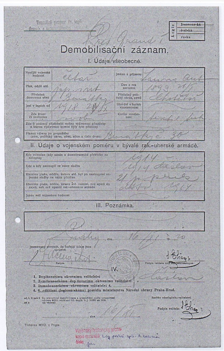 Konec v legiích:19.1.11920 ( Demobilizován )