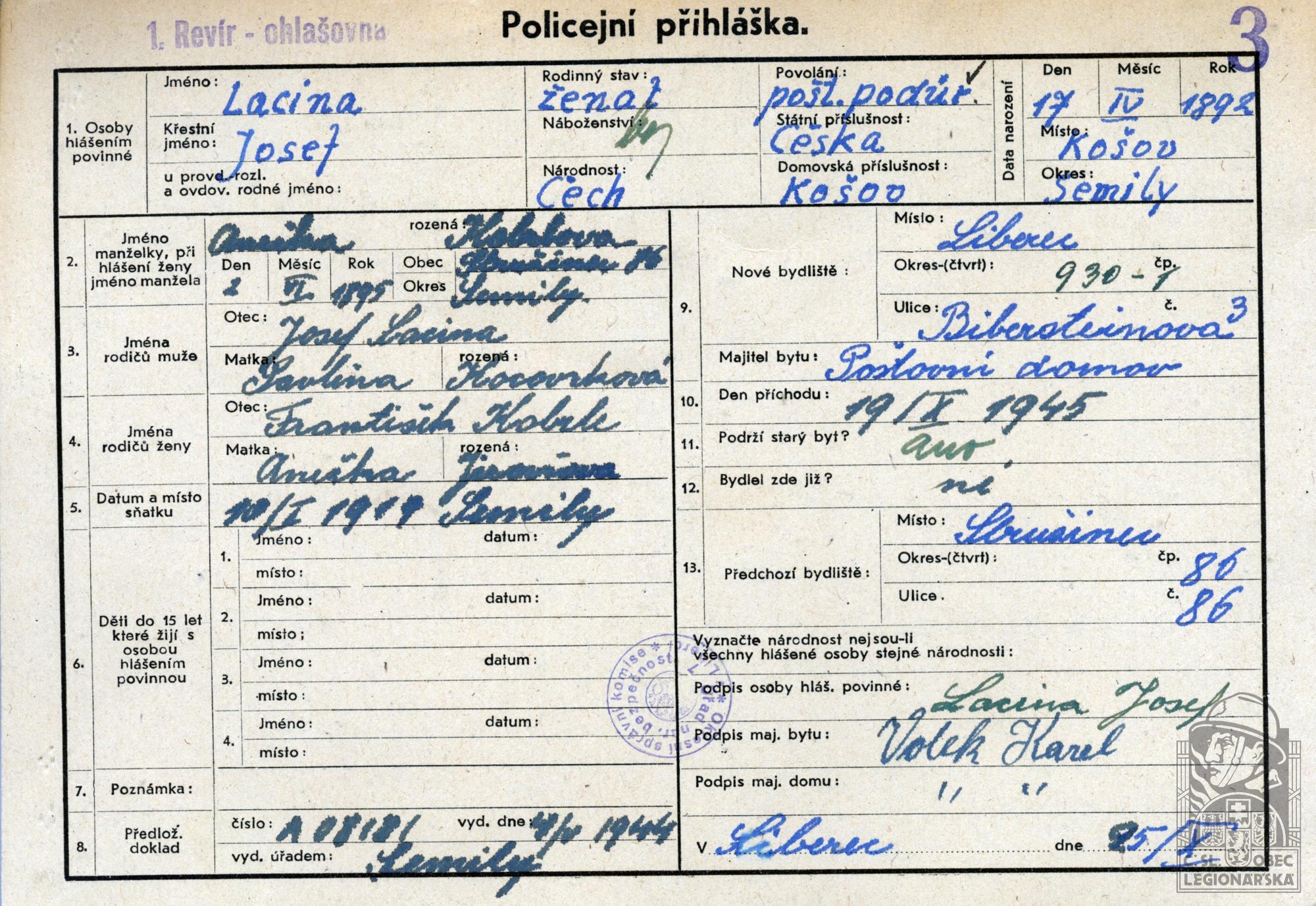 Zdroj informací: legionářský poslužný spis osobní karta legionáře