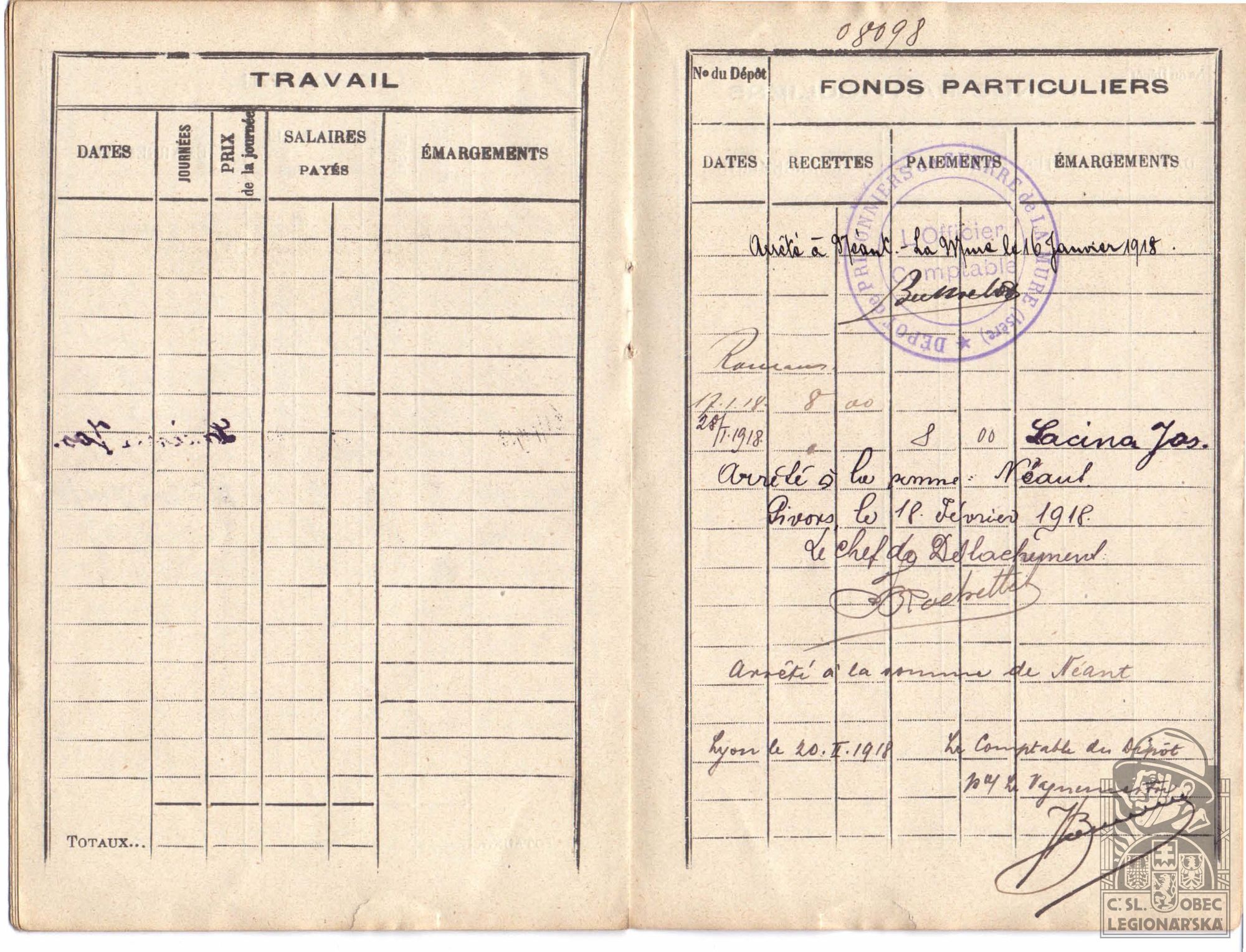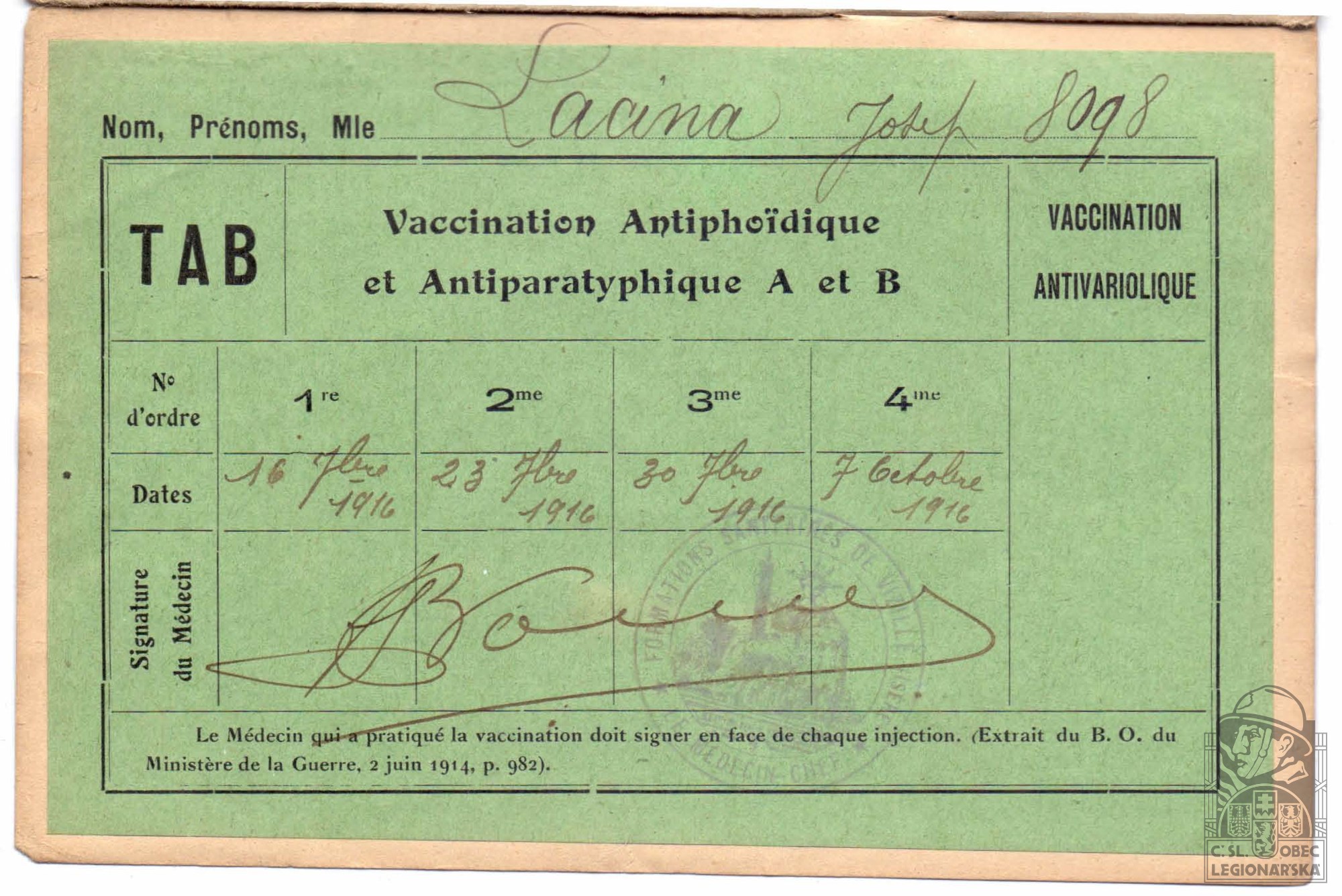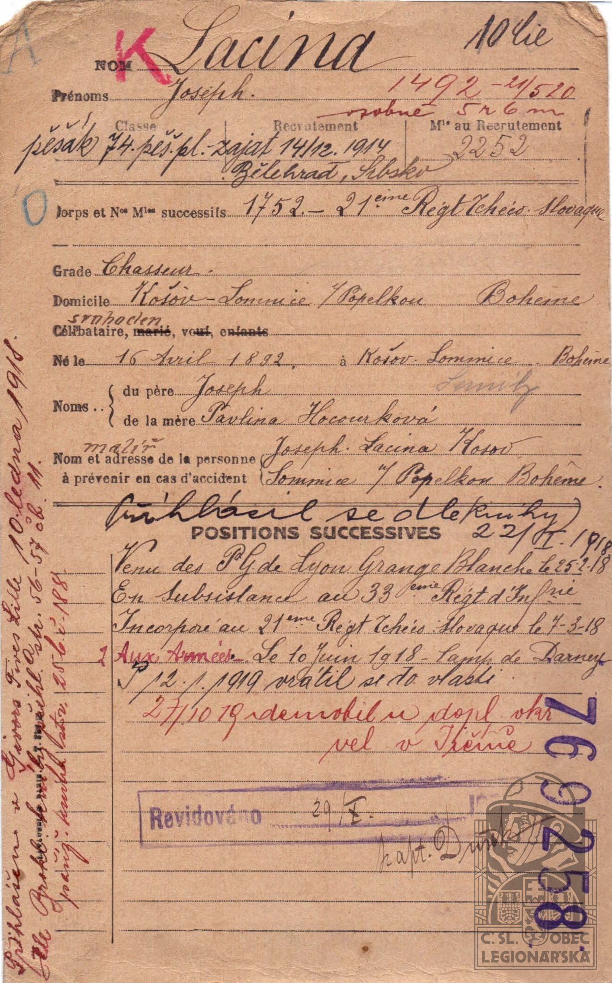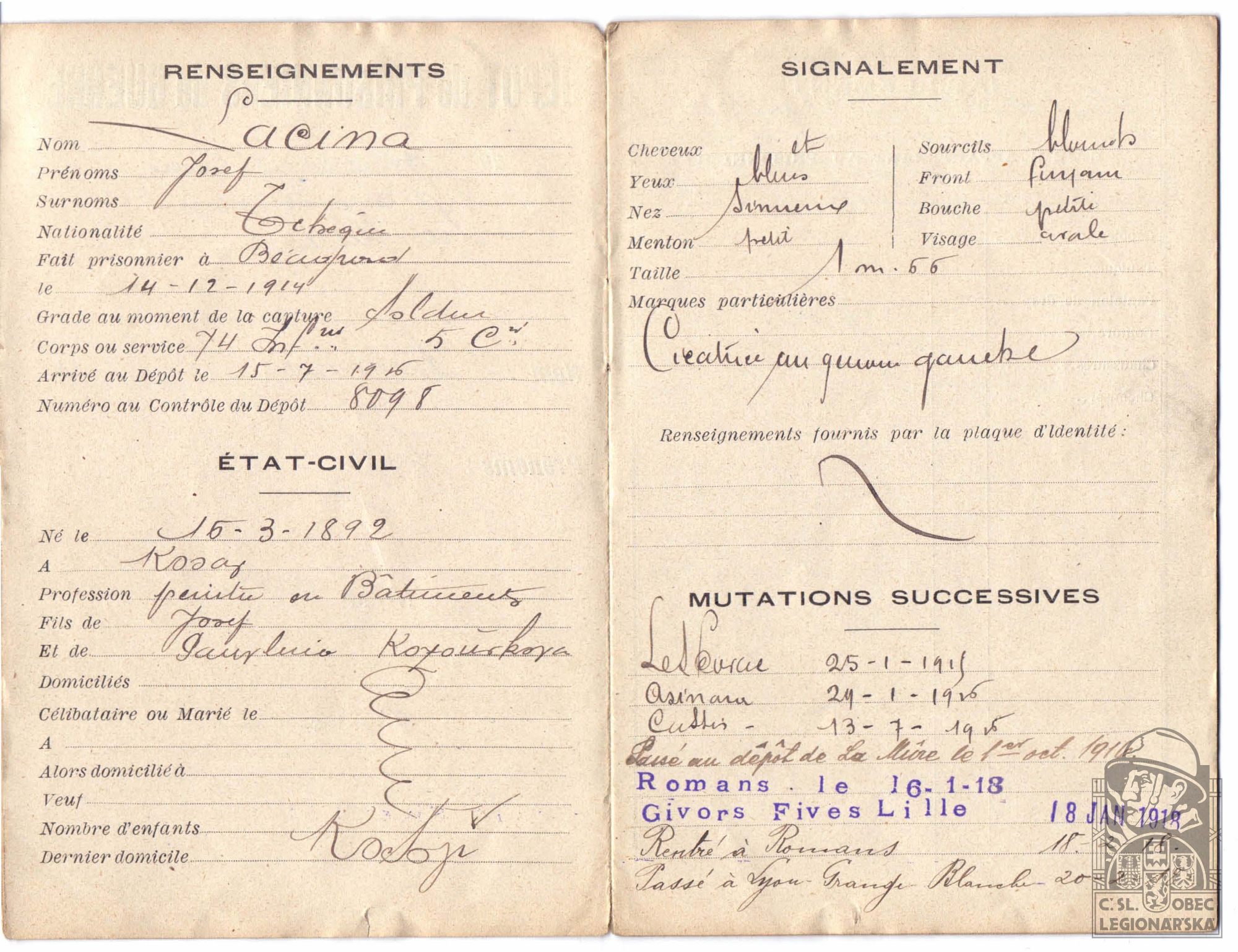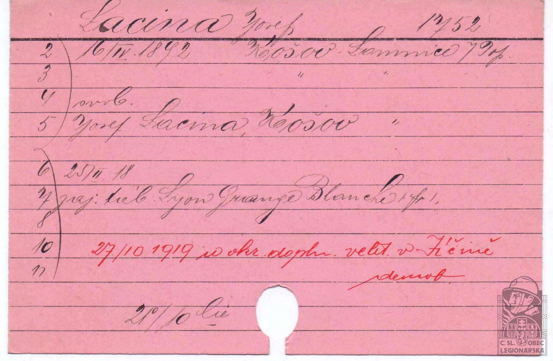 Jednotka v době zařazení:21.p.pl. ( Čs. legie v Francii )