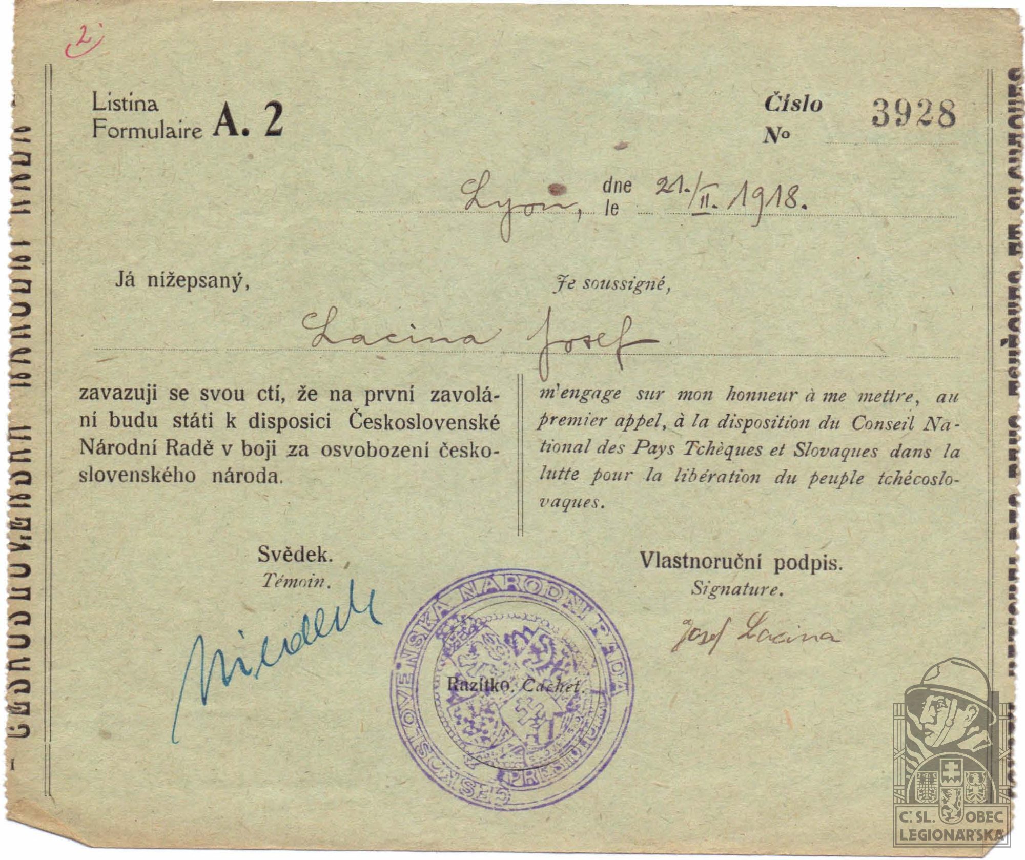 Datum podání přihlášky do legií:22.1.1918