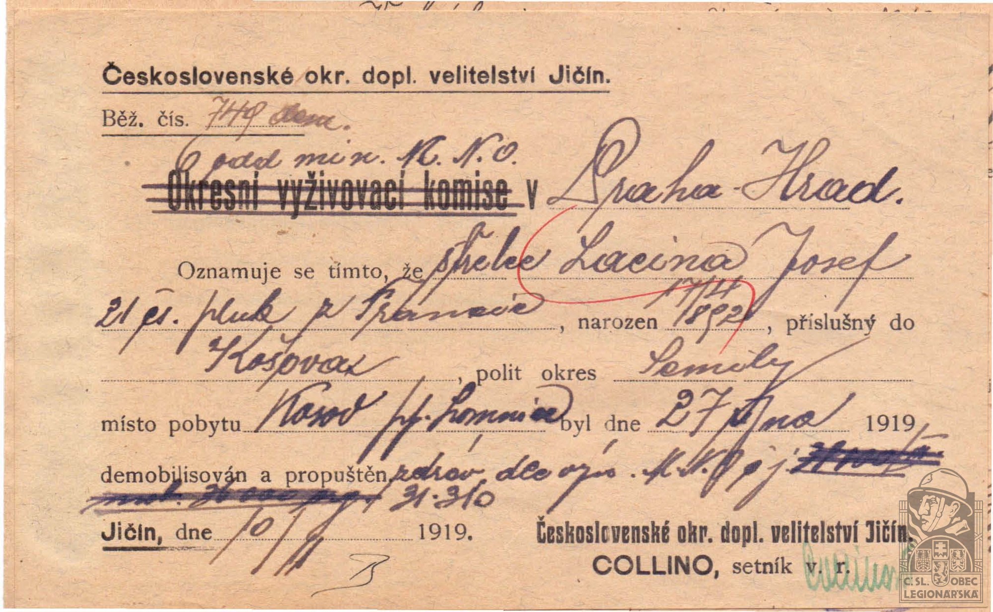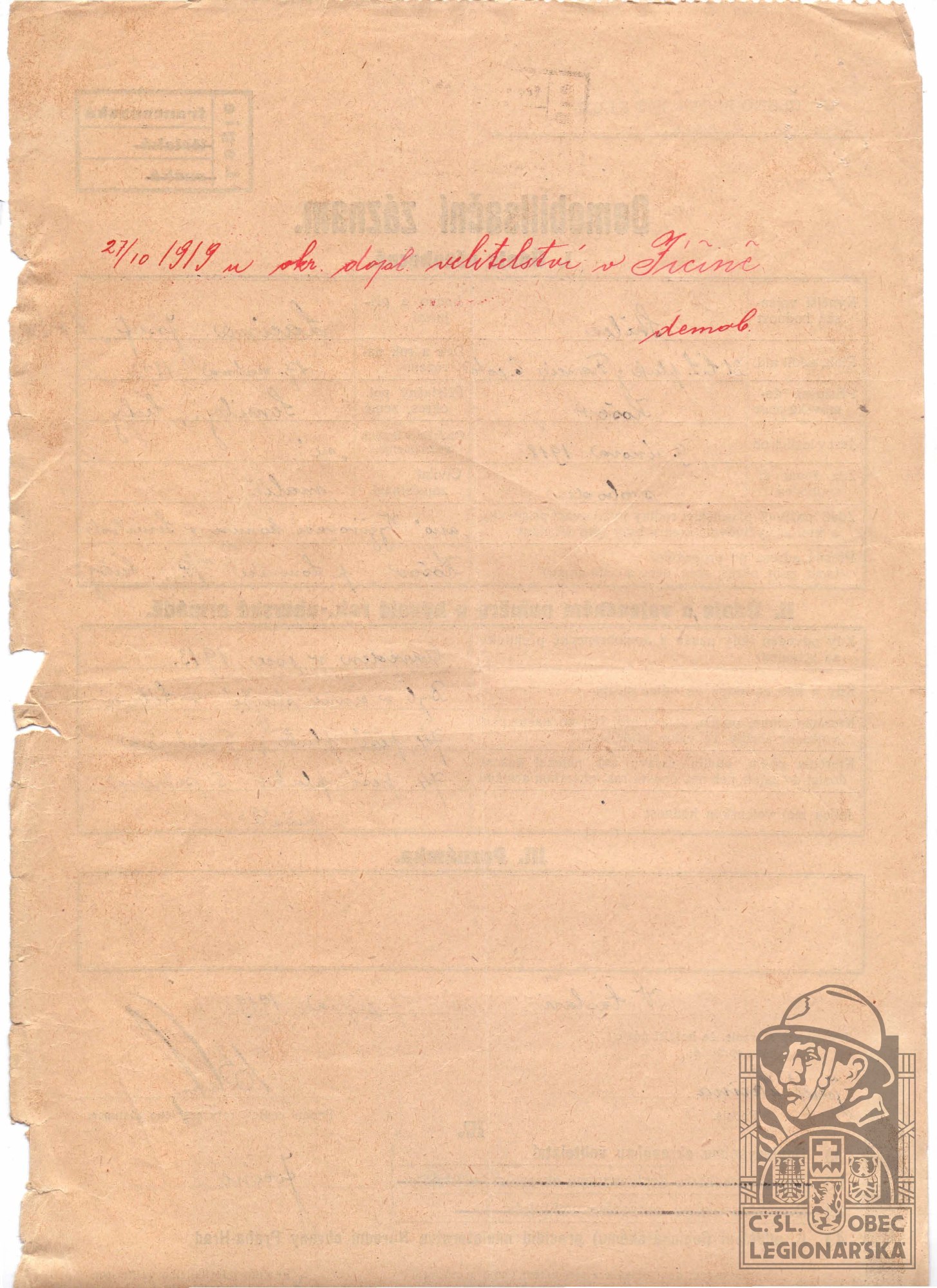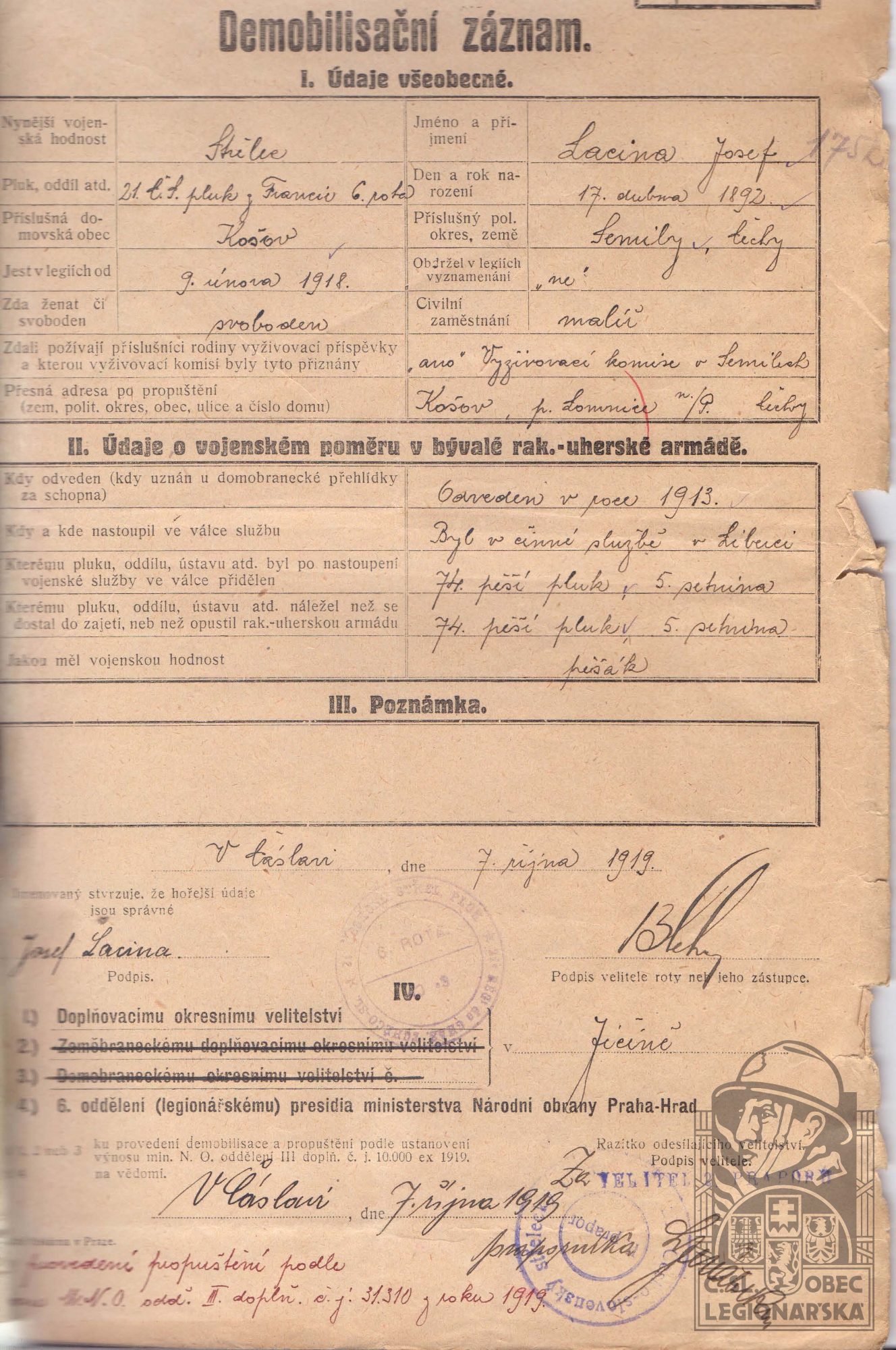 Konec v legiích:27.10.1919 ( Demobilizován )