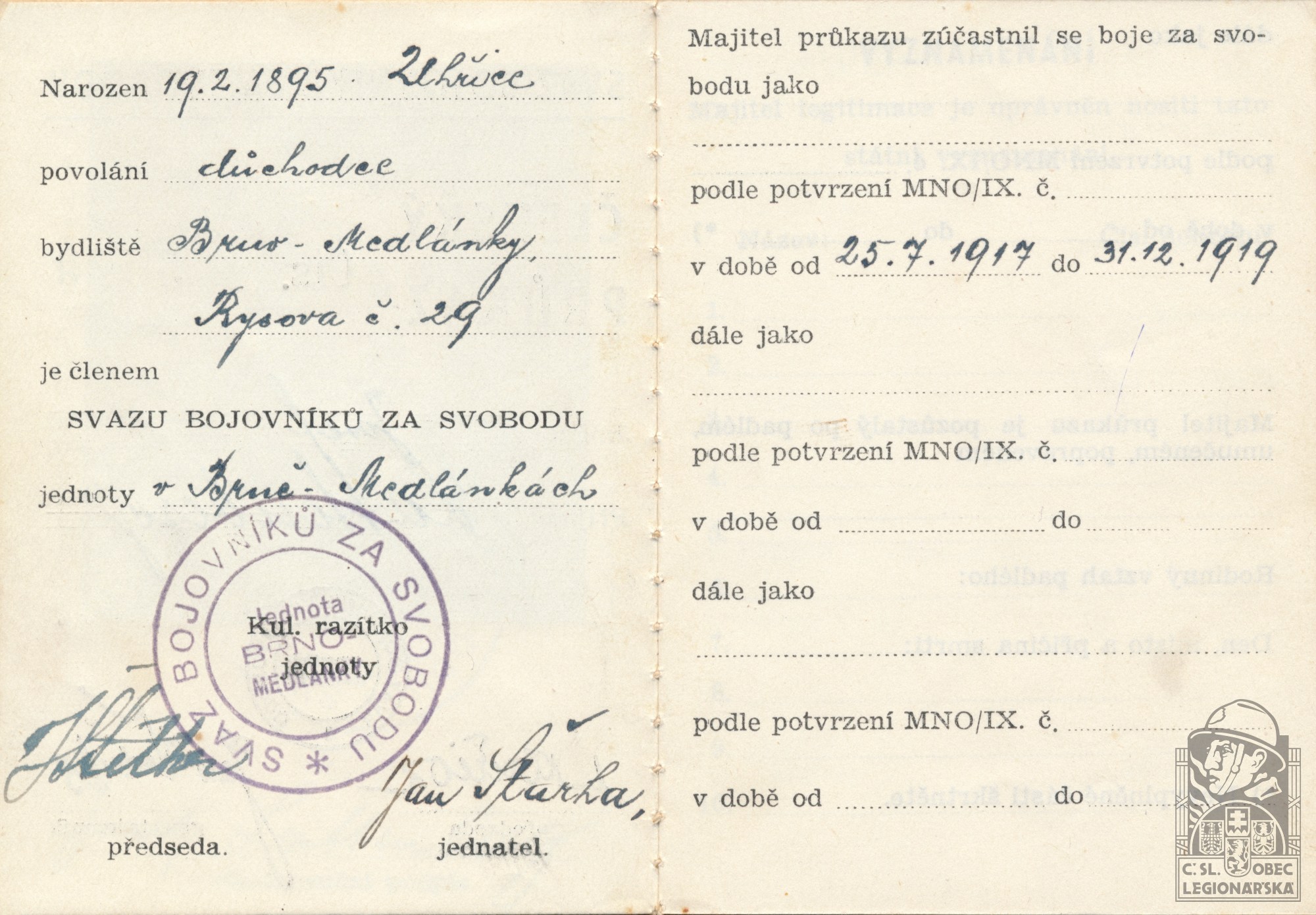 Zdroj informací: legionářský poslužný spis osobní karta legionáře
