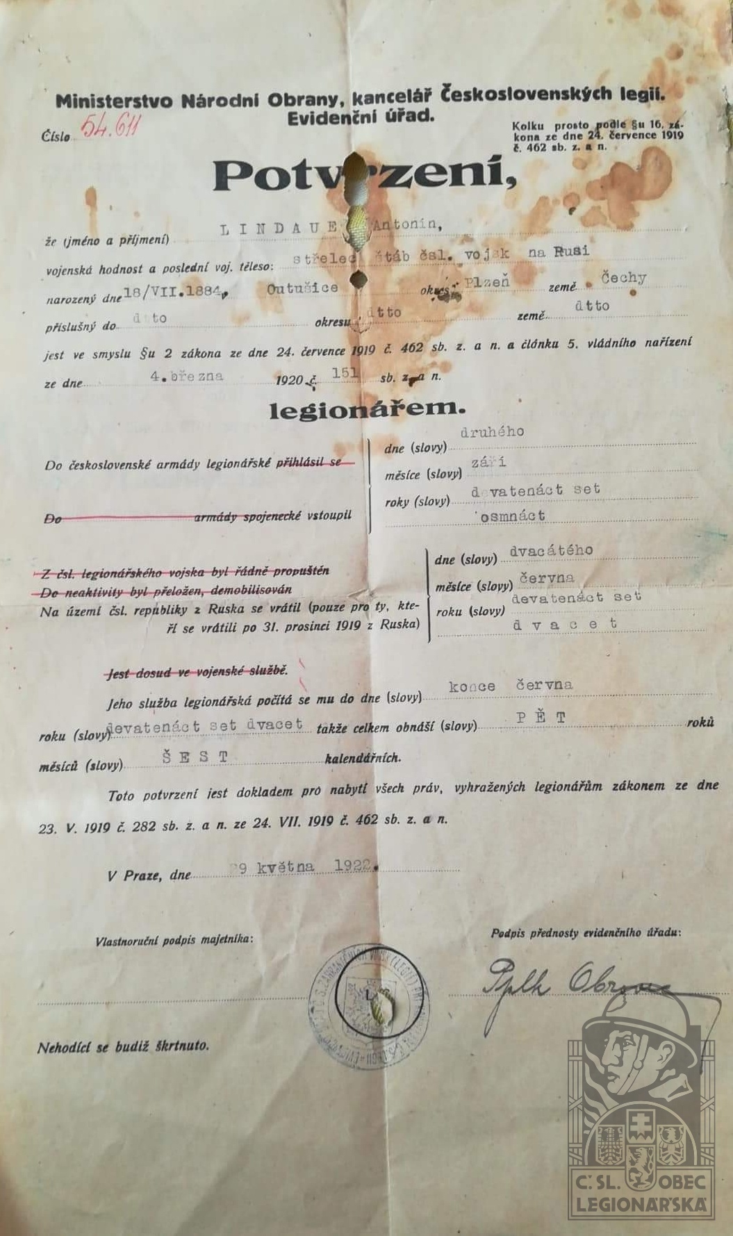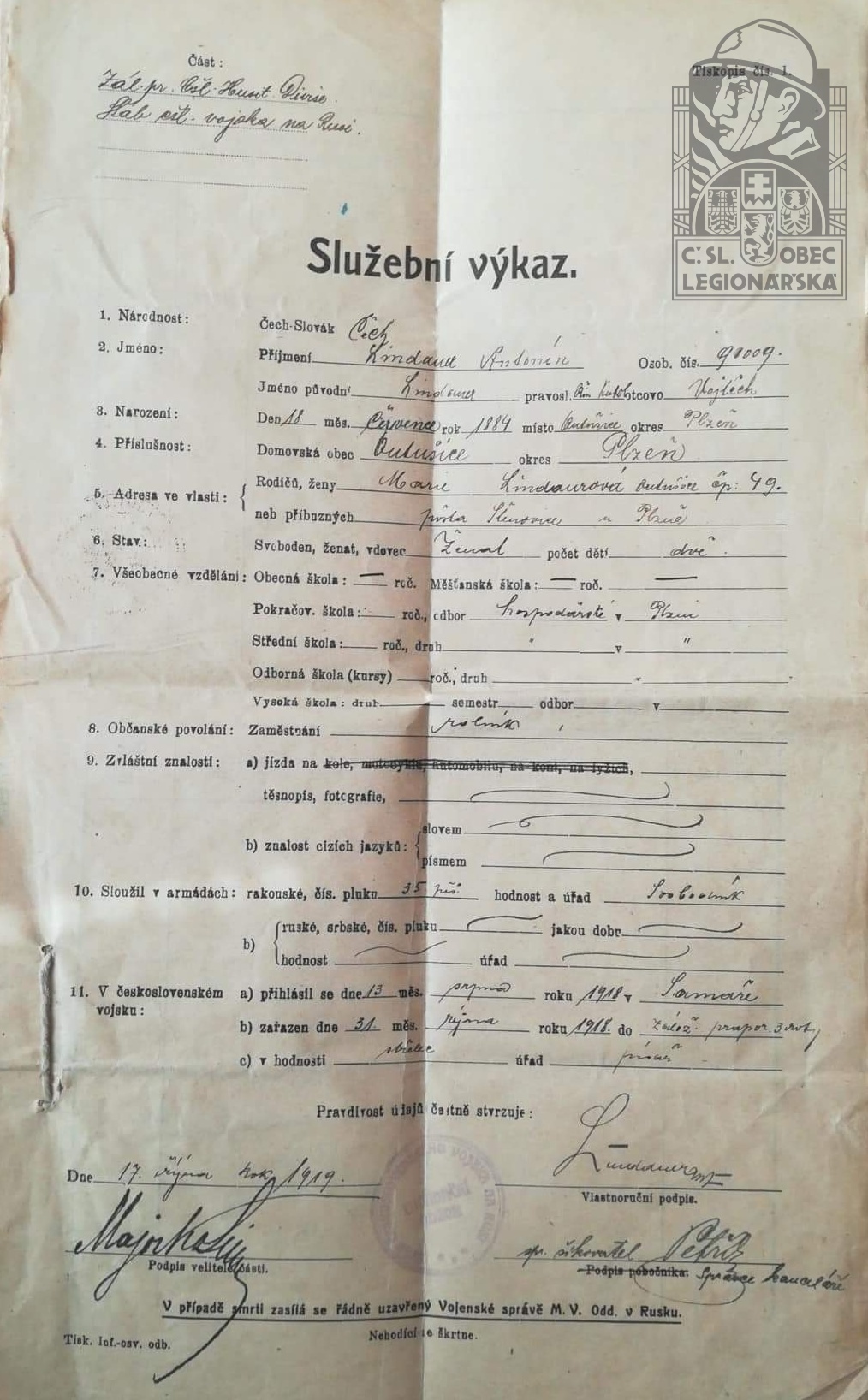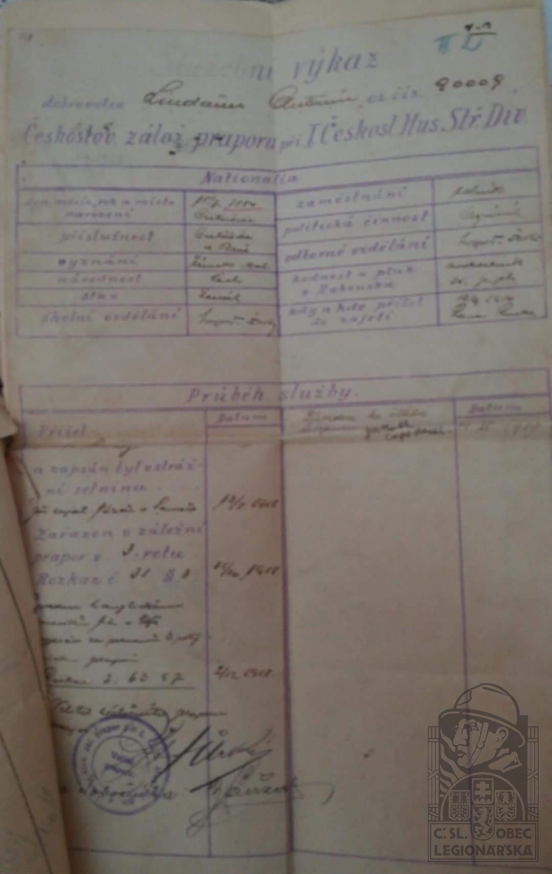 Zdroj informací: legionářský poslužný spis osobní karta legionáře