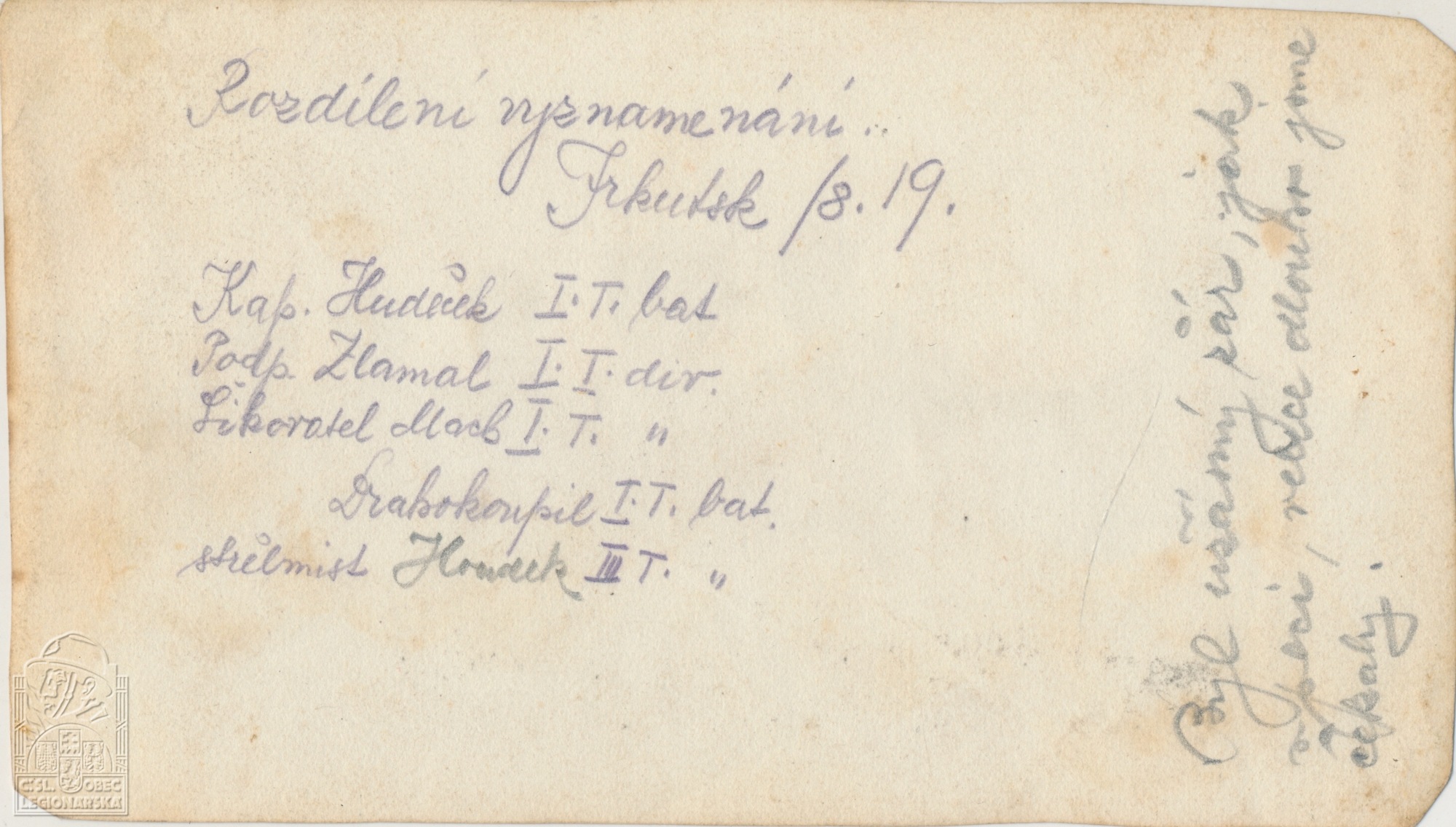 Jednotka v době zařazení:1.stř.pl. ( Čs. legie v Rusku )