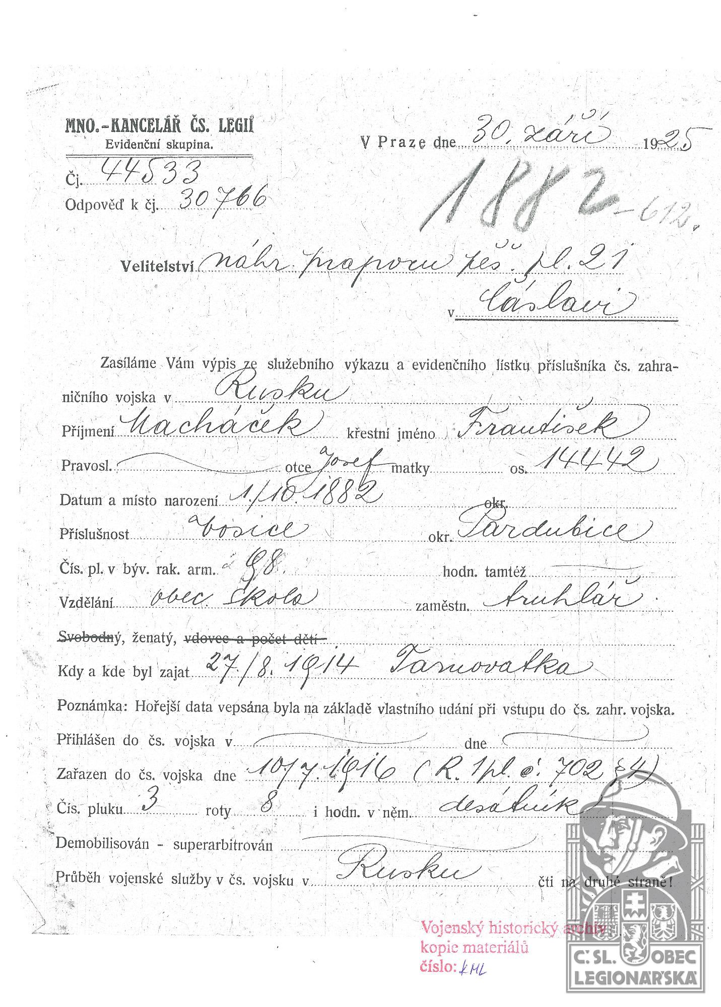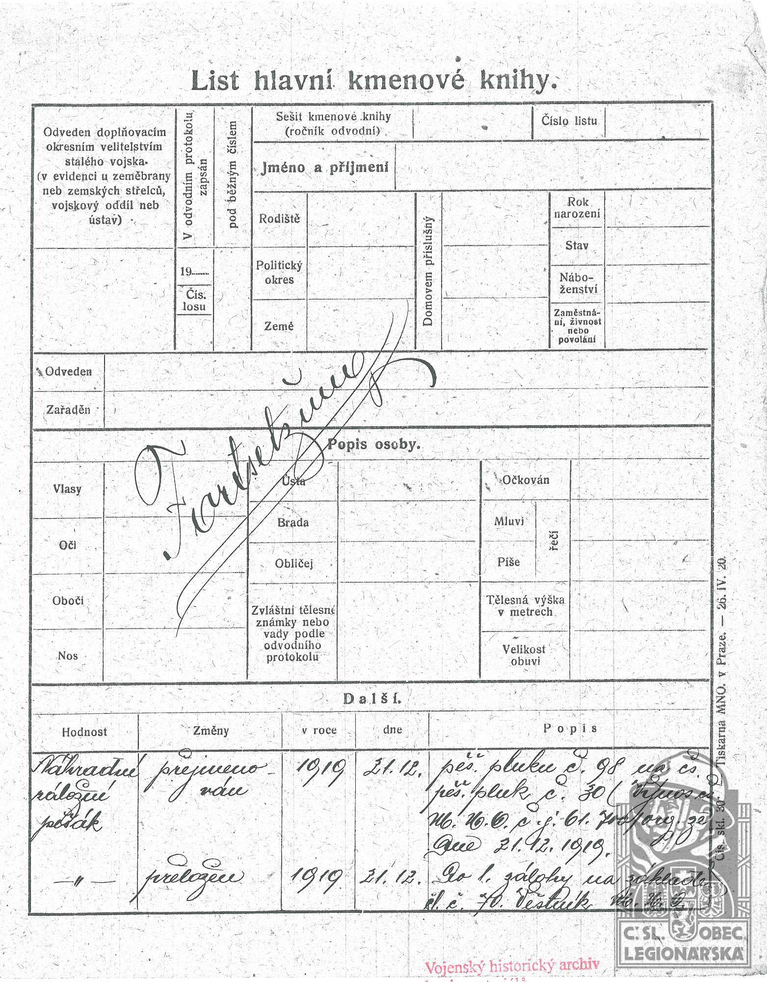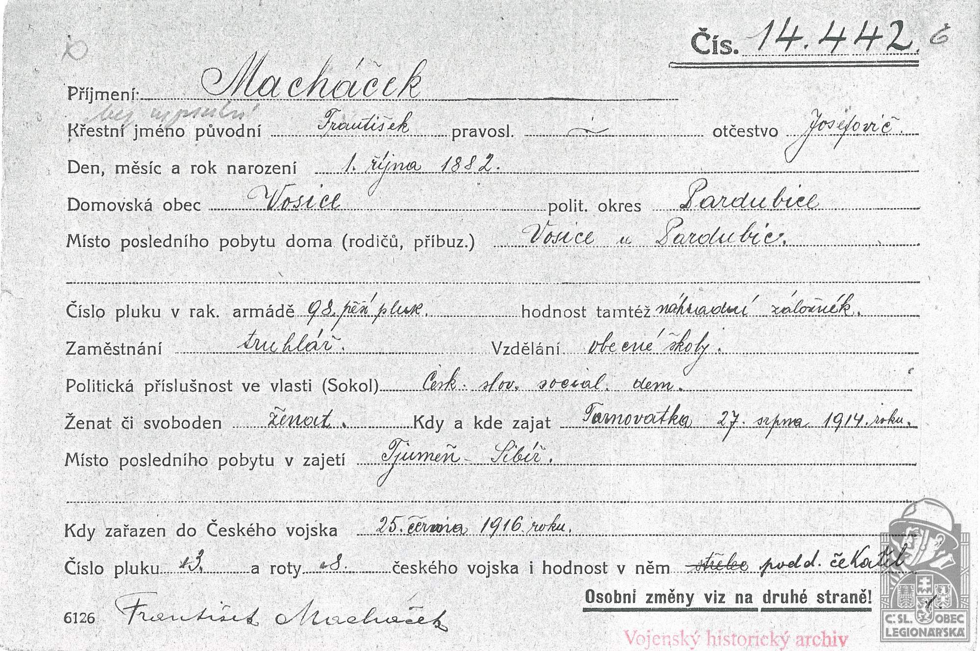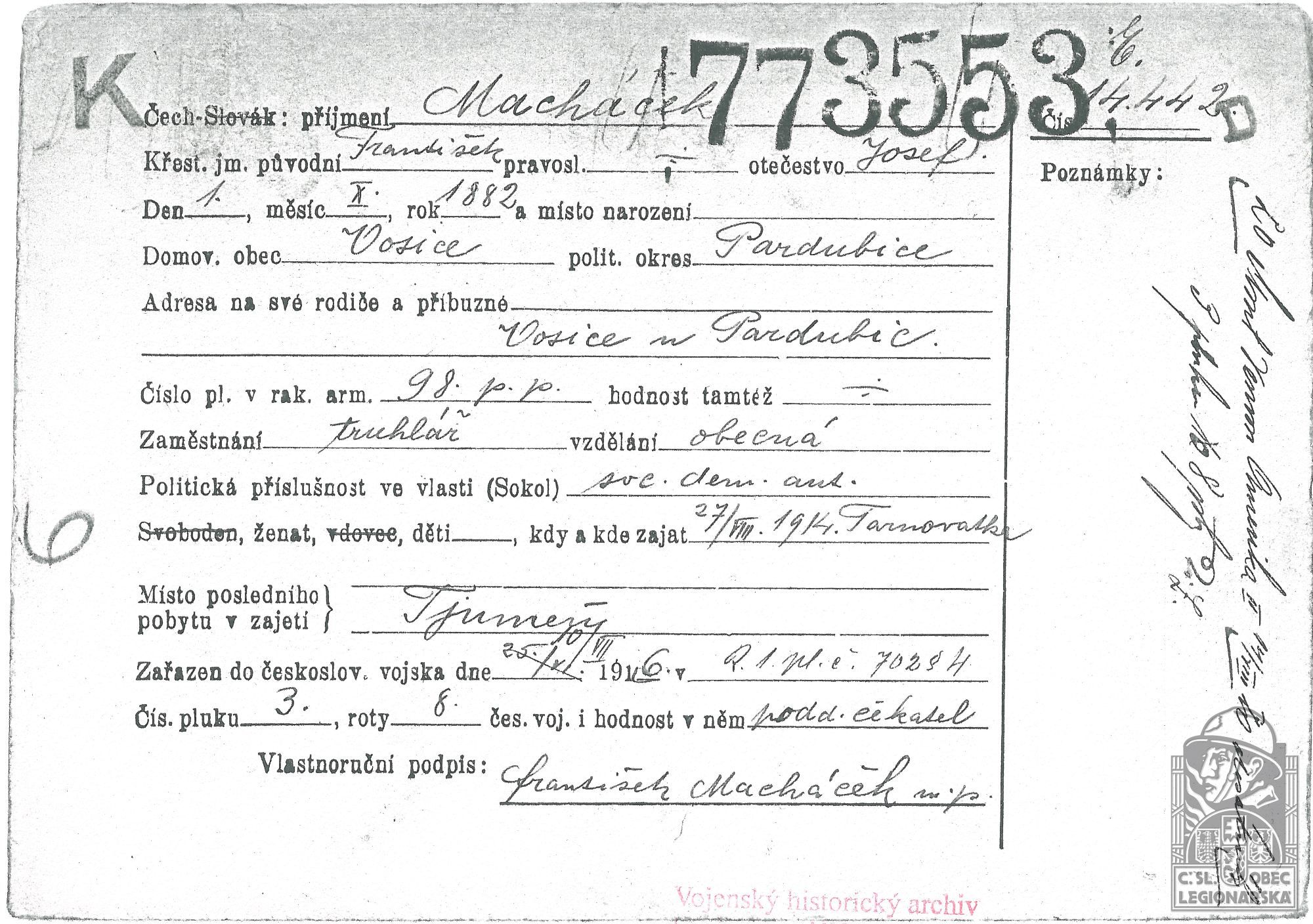 Zdroj informací: legionářský poslužný spis osobní karta legionáře
